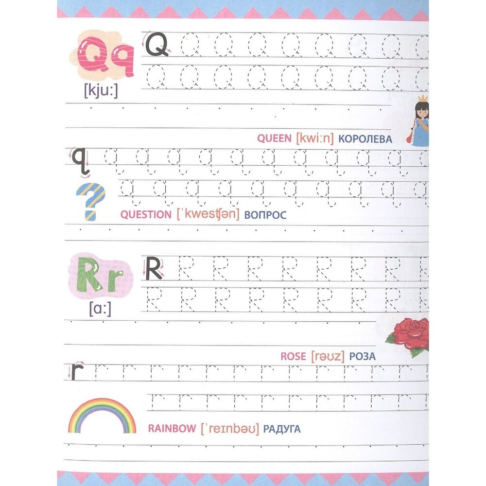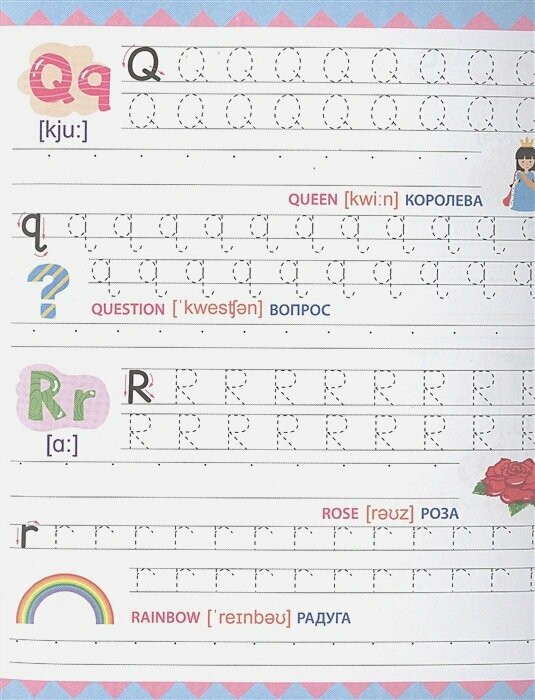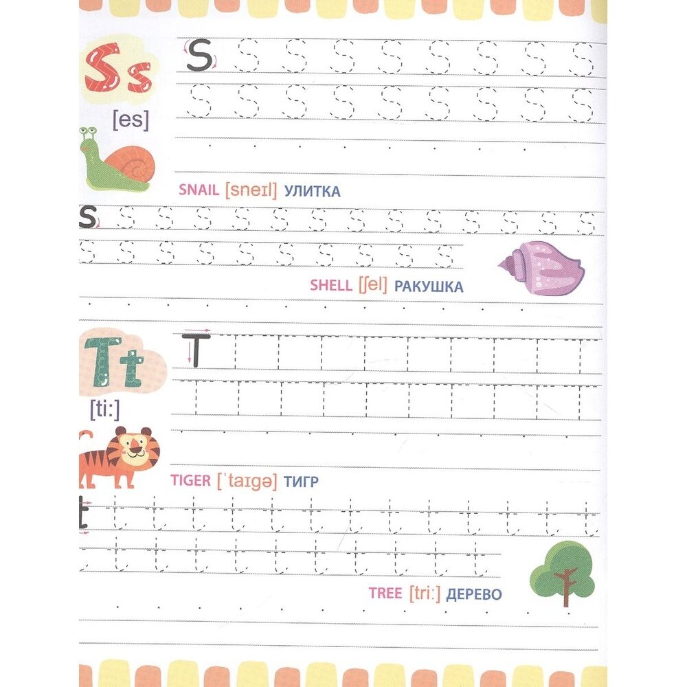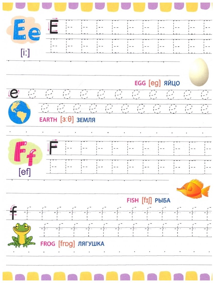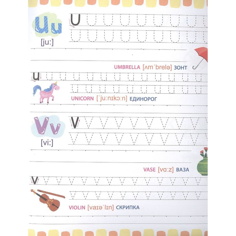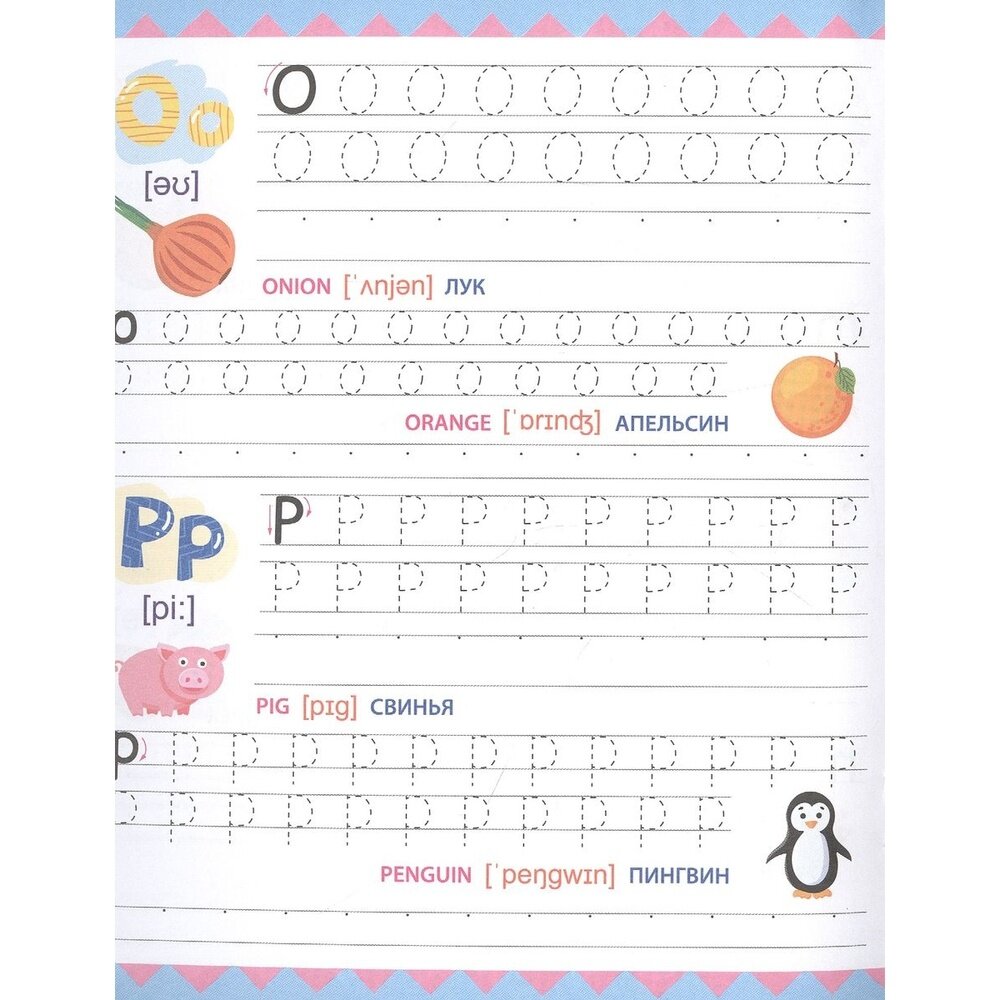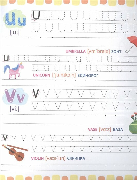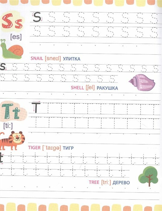 Отличное издание для тех, кто только учится писать свои первые английские буквы и цифры! На каждой странице по 2 буквы. Каждая буква сначала дважды прописывается по пунктирам, а затем по опорным точкам. Буквы сопровождаются небольшими цветными картинками. Для каждой картинки - английское и русское название и транскрипция. Отдельно хочу оценить высокое качество и плотность бумаги! Отличные прописи, очень понравились!!!