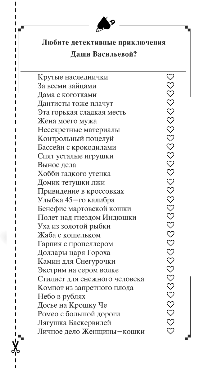 Я думаю, что не я одна с нетерпением жду выхода каждой новой книги Дарьи Донцовой. Я читаю её книги с самых первых изданий. Не смотря на количество написанных Дарьей книг до сих пор читаю с огромным интересом и удовольствием. Даша Васильева самая первая героиня и на протяжении многих лет я слежу за её приключениями. Интрига, динамичность, юмор и много оптимизма «заставляют» читать книги Донцовой вновь и вновь.