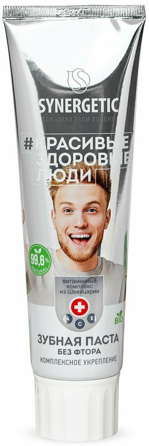 Натуральная зубная паста для комплексного укрепления SYNERGETIC со вкусом «УЛЬТРАМЯТА» – безопасная и эффективная паста без фтора, которая предназначена для активной реминерализации и укрепления зубной эмали и защиты десен. Активные компоненты в этой пасте ? минерал гидроксиапатит и лактат кальция, которые способствуют реминерализации эмали. Растительные компоненты из Германии, швейцарские витамины A, C, E, цитрат цинка и экстракты шалфея, ромашки и розмарина улучшают обменные процессы и восстанавливают здо