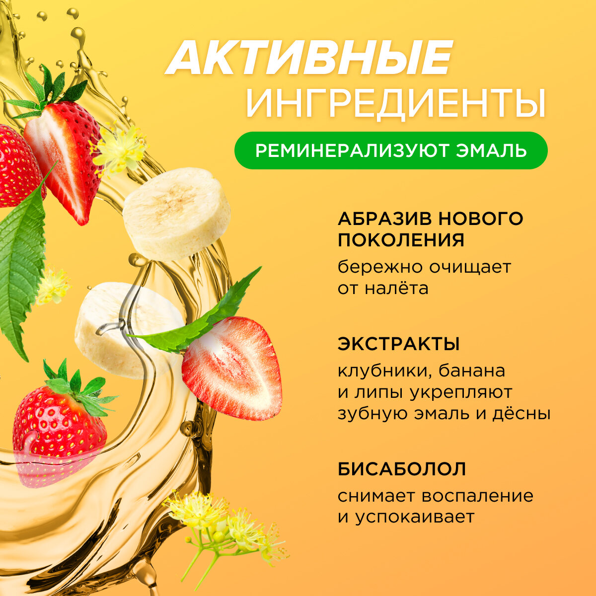 | Химический состав | Sorbitol, Silica, Glycerin, Aqua, Sodium Lauroyl Sarcosinate, Xylitol, Xanthan Gum, Calcium Lactate, Tilia Сordata Еxtract, Fragaria Vesca Fruit Extract, Musa Acuminata (Banana) Fruit Extract, Bisabolol, Sodium Benzoate, Рotassium Sorbate. |