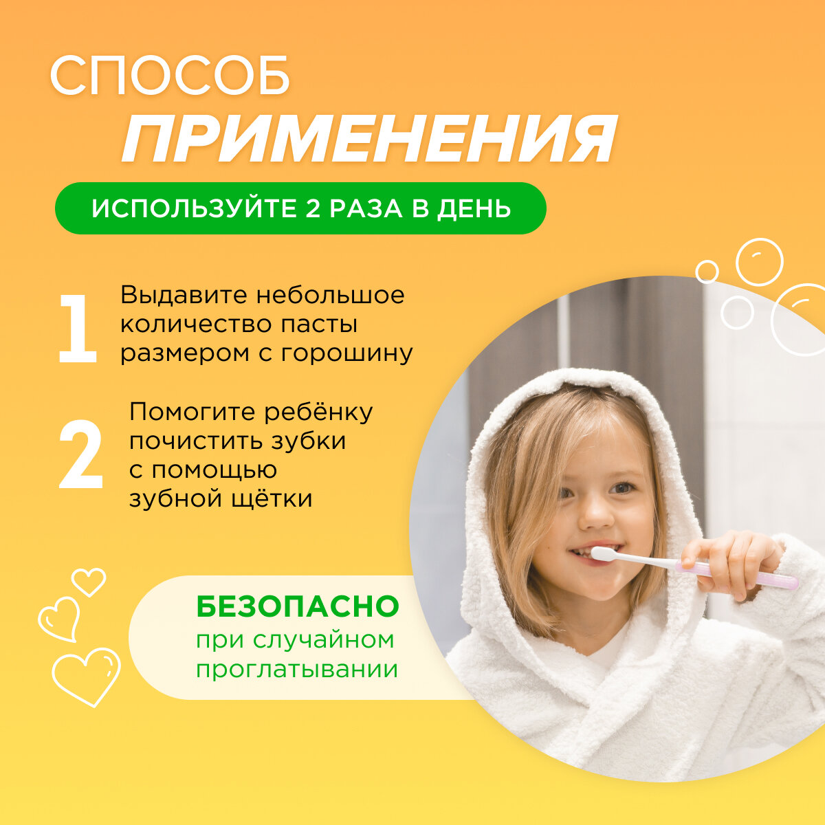 | Способ применения | Для ежедневного применения. Рекомендуется чистить зубы 2 раза в день в присутствии взрослых количеством пасты размером с горошину. Безопасна при случайном проглатывании. |