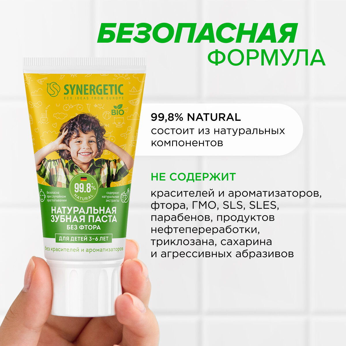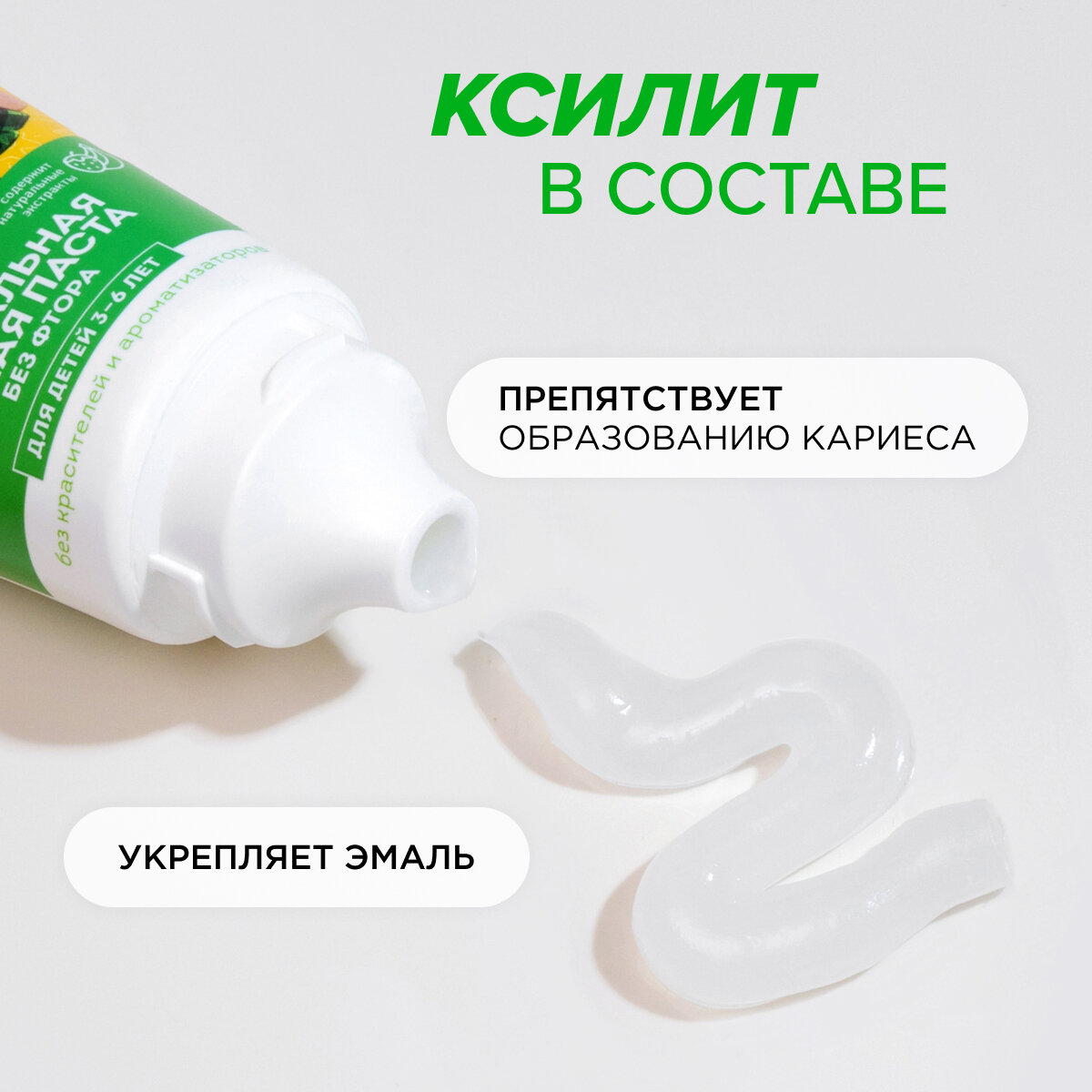 - Не содержит: красители и ароматизаторы, фтор, ГМО, SLS, SLES, парабены, продукты нефтепереработки, триклозан, сахарин, агрессивные абразивы.