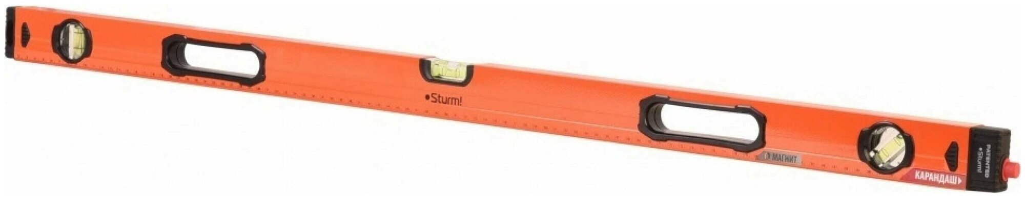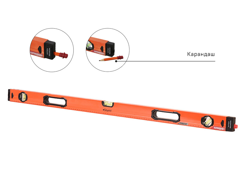 Переход от замера к разметке и обратно стал максимально быстрым, что в разы экономит время в процессе работы. Крепление осуществляется специально разработанной резиновой втулкой, которая надёжно удерживает карандаш, а так же позволяет его быстро извлечь и вернуть на место, исключая возможную потерю. 3 высокоточные колбы из ударопрочного плексигласа, литой цельнометаллический профиль, стойкость у ударам, фрезерованная поверхность для лучшего сцепления с поверхностью и увеличения точности измерения, магнит, измерительная шкала, ручки для переноса.ПроизводительSturm!Преимущества товараУникальная запатентованная система позволяет хранить карандаш прямо в корпусе уровня, благодаря чему он будет всегда под рукой. Профиль на 30% тоще обычного - устойчивость в внешнему воздействию и сохранение точных показаний