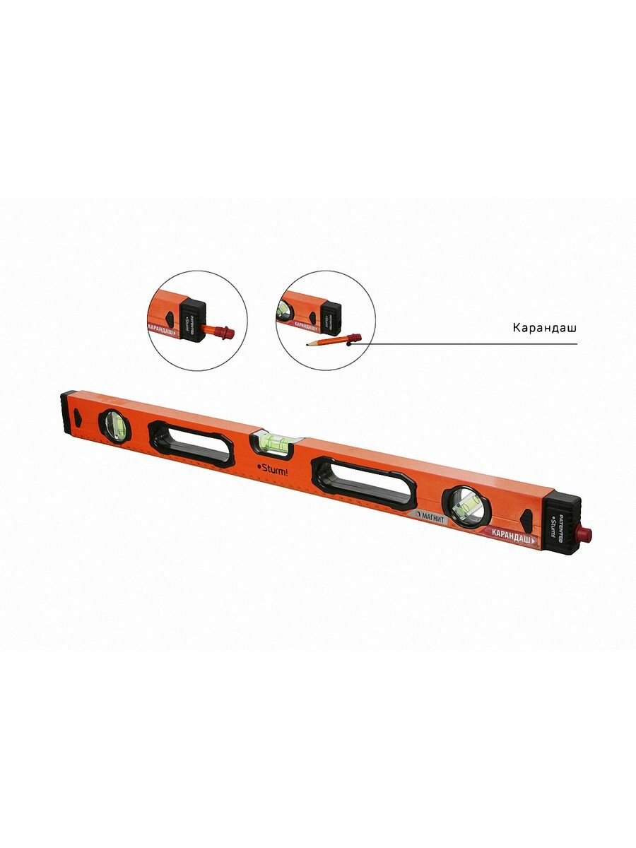Строительный уровень Sturm длиной 600 мм оснащён уникальным запатентованным карандашом, который всегда находится под рукой благодаря уникальной запатентованной системе хранения.Преимущества Уникальная запатентованная система хранения карандаша в корпусе уровня Быстрое переключение между замером и разметкой благодаря специальному креплению с резиновой втулкой, которая надёжно удерживает карандаш и позволяет быстро его извлекать и возвращать на место Усиленный профиль для сохранения точности измерений Магнит для фиксации на любых магнитящихся поверхностях Резиновые боковые заглушки для амортизации удара при случайном падении