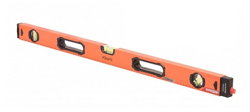 Уровень строительный Sturm длиной 800 мм оснащён уникальным запатентованным механизмом хранения карандаша прямо в корпусе уровня, что обеспечивает его постоянное наличие под рукой.Преимущества Уникальная запатентованная система хранения карандаша в корпусе уровня обеспечивает его постоянное наличие под рукой Переход от замера к разметке и обратно стал максимально быстрым благодаря креплению карандаша специальной резиновой втулкой, которая надёжно удерживает и позволяет быстро извлекать карандаш Увеличенная точность измерений благодаря усиленному профилю уровня, трём высокоточным колбам из ударопрочного плексигласа и литому цельнометаллическому профилю Фрезерованная поверхность для лучшего сцепления с поверхностью и увеличения точности измерения Магнит для фиксации на любых магнитящихся поверхностях Измерительная шкала для удобства использования Ручки для переноса уровня обеспечивают удобство хранения и транспортировки