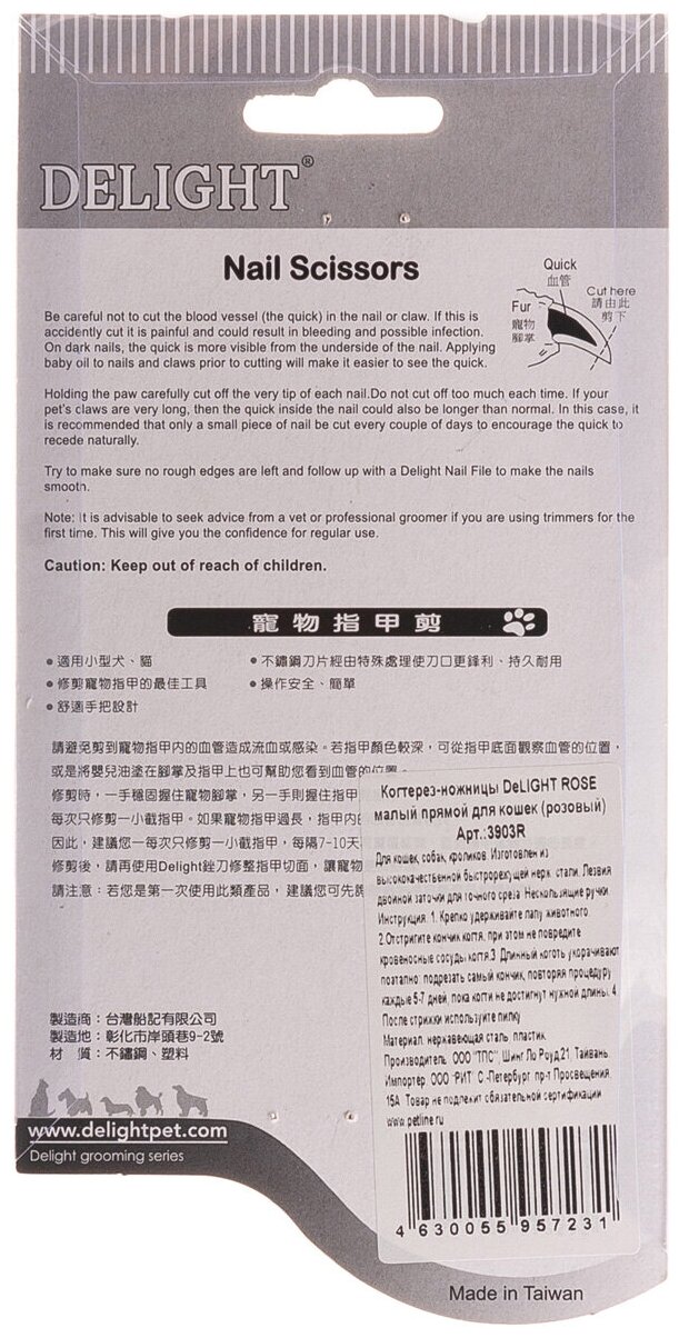 Когтерез-секатор DeLIGHT ROSE малый со стопором предназначен для мелких и средних пород кошек, собак, кроликов, птиц и грызунов. Инструмент изготовлен из высококачественной и высокопрочной нержавеющей стали, за счет чего он долго остается острым, прочным и надежным даже при частом использовании. Лезвия двойной заточки производят быстрый, точный и легкий срез, который не оставляет сколов и повреждений на когте питомца. Стопор для ногтя обеспечивает надежную защиту вашему питомцу от повреждения и сделает срез оптимальным по длине, не повреждая сосуды, а фиксатор закрытого положения защитит инструмент, сделает его хранение удобным и компактным. Эргономичные прорезиненные ручки удобны и комфортны, не скользят и не перегружают мышцы даже при длительной работе. Инструменты для груминга DeLIGHT - превращаем заботу в удовольствие!