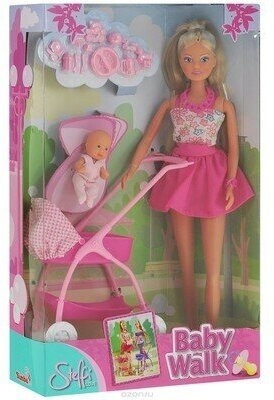 | Комплектация | 1 кукла Штеффи, коляска для ребеночка, кухонная посуда, маленький пупсик, упаковка |