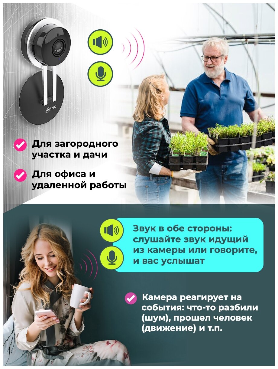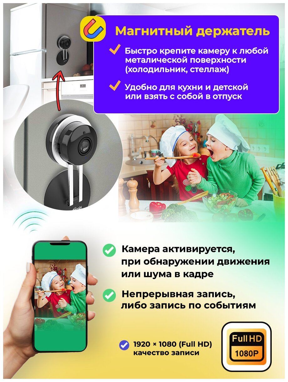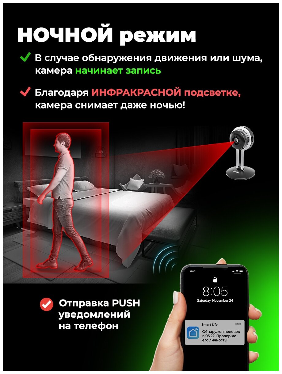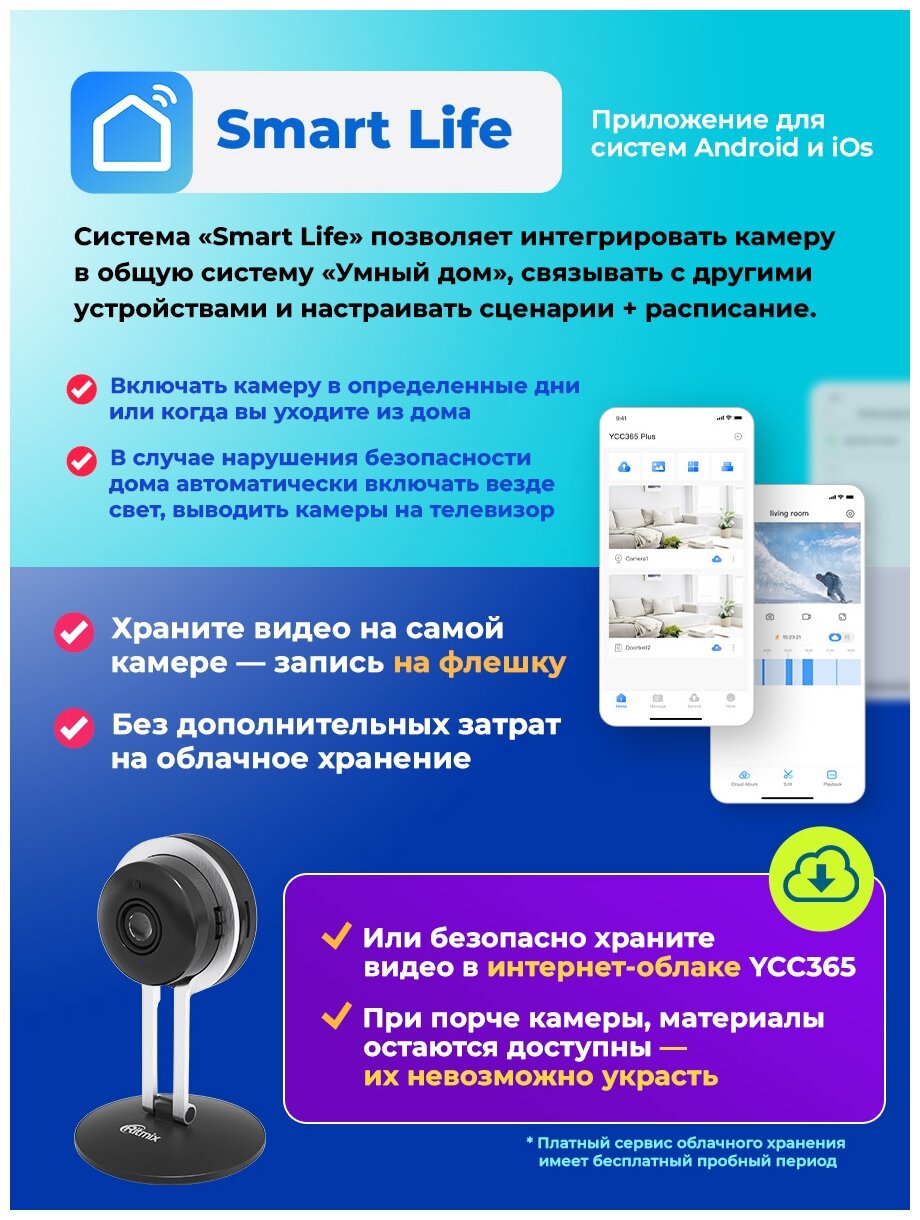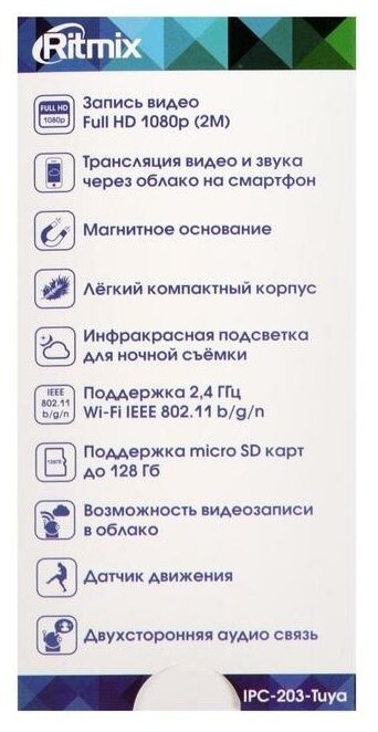 Wi-Fi камера наблюдения , запись видео в разрешении Full HD 1080p 2Мр, трансляция видео и звука по Wi-Fi через облако на смартфон, бесплатное приложение SmartLife или TuyaSmart для Android и iOS, двусторонняя аудиосвязь через приложение, ИК подсветка для ночной съёмки, автоматическое переключение ночной-дневной съёмки, датчик движения, запись непрерывно или по датчику движения, запись видео на карту памяти / запись видео в облако (доп. опция, 14 дней бесплатно, продление пользователем самостоятельно по желанию), поддержка карт памяти micro SD до 128 Гб, настольное / настенное / потолочное расположение (переворот изображения, магнитное крепление в основании, лёгкий корпус), питание от micro USB (5В, 1,5А), USB кабель питания в комплекте. В систему умного дома Tuya можно самостоятельно независимо добавить умные розетки, лампы, датчики движения, открытия двери/окна, протечки воды и многое другое.