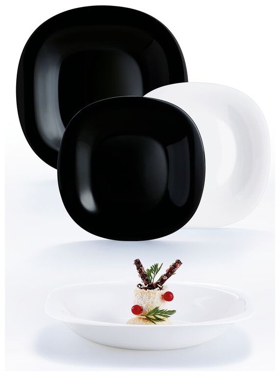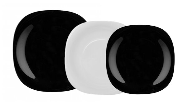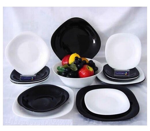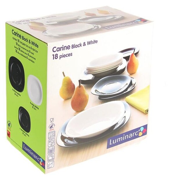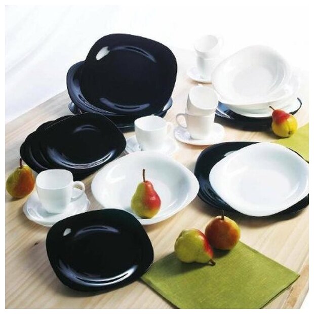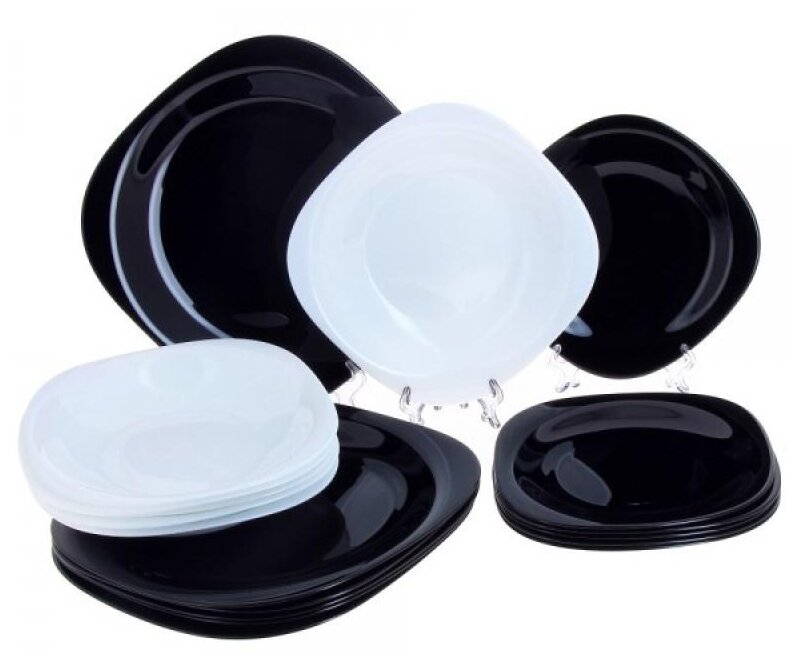 | Комплектация | тарелка десертная 19см - 6 шт(черная), тарелка обеденная 26,5 см - 6 шт(белая), тарелка суповая 21 см - 6 шт(черная). |