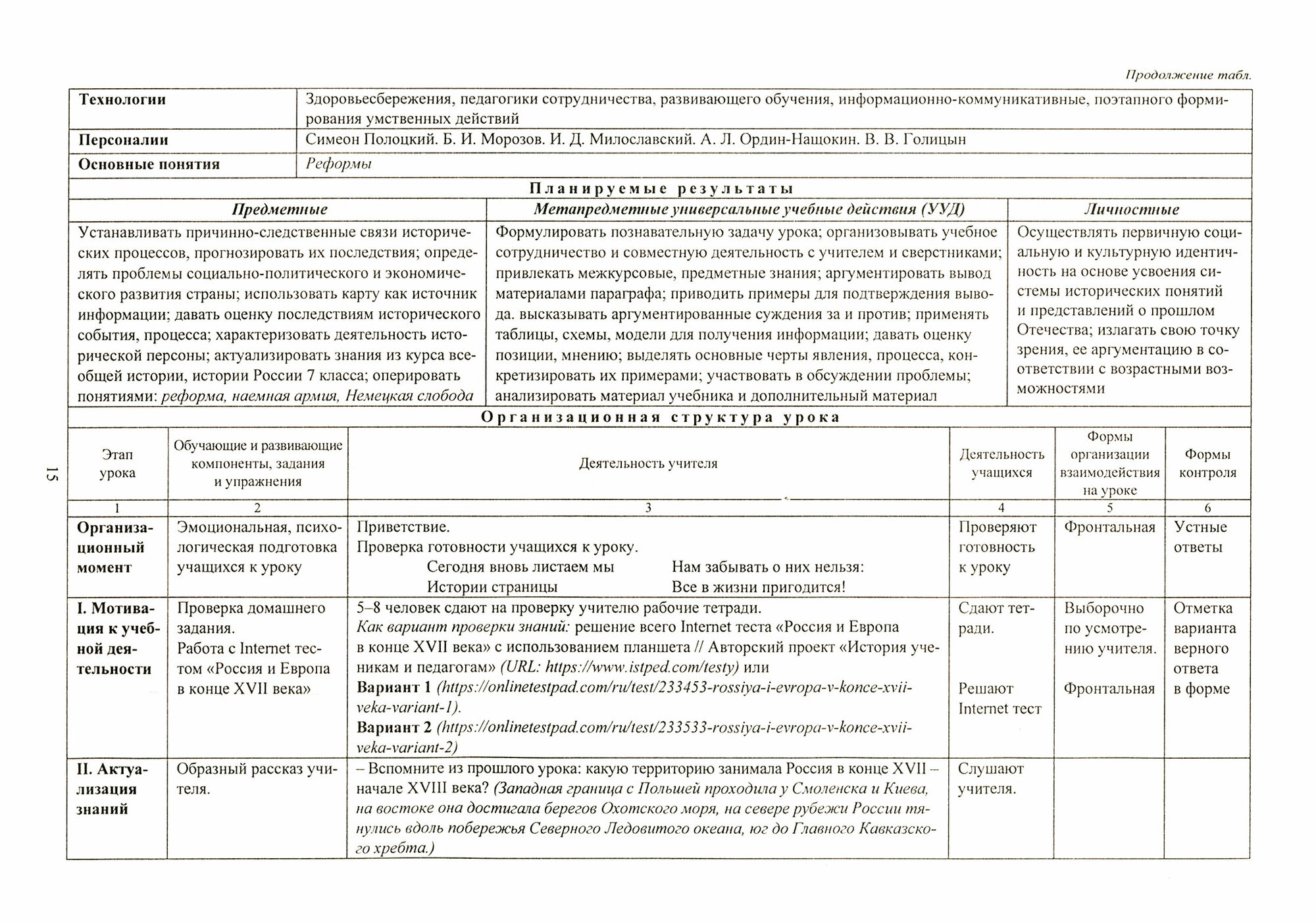 В пособии представлены технологические карты уроков по предмету "История России" для 8 класса, разработанные в соответствии с ФГОС, требованиями Примерной программы основного общего образования для 5-9 классов, ориентированные на работу по учебнику под редакцией А. В. Торкунова (М.: Просвещение, 2020) и предназначенные для структурирования образовательного процесса на уровне проектирования и конструирования, включая описание действий преподавателя и обучающихся (целеполагание, организация, оценивание и формы контроля, регулирование результатов).