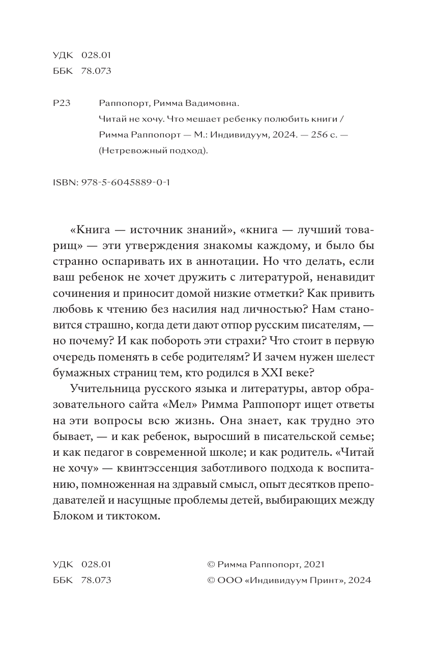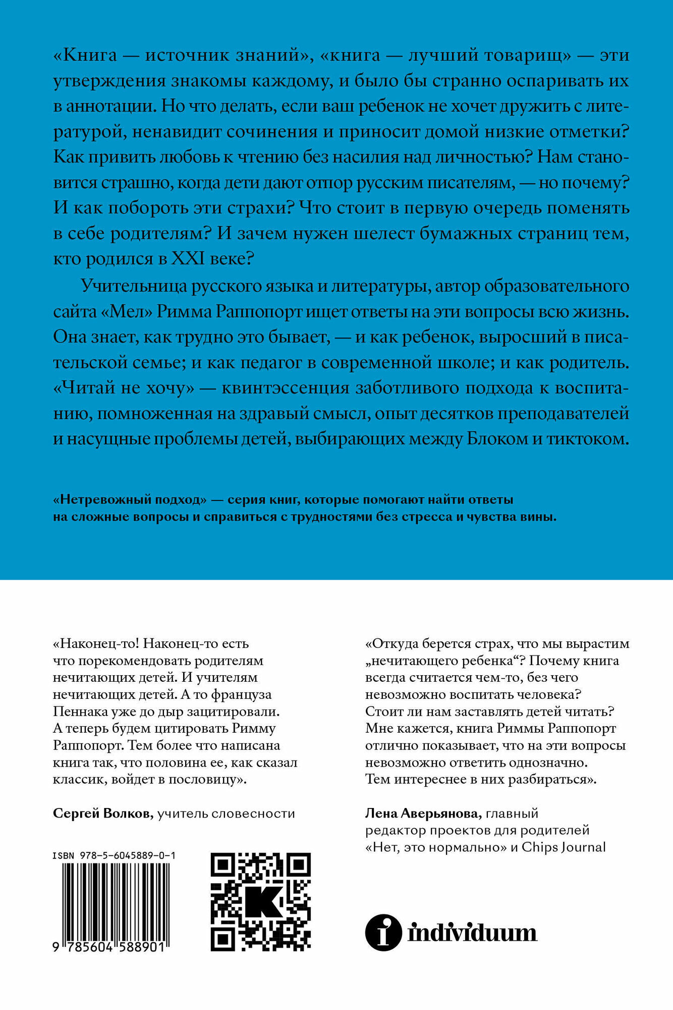 Учительница русского языка и литературы, автор образовательного сайта "Мел" Римма Раппопорт ищет ответы на эти вопросы всю жизнь. Она знает, как трудно это бывает, - и как ребенок, выросший в писательской семье; и как педагог в современной школе; и как родитель. "Читай не хочу" - квинтэссенция заботливого подхода к воспитанию, помноженная на здравый смысл, опыт десятков преподавателей и насущные проблемы детей, выбирающих между Блоком и тиктоком.