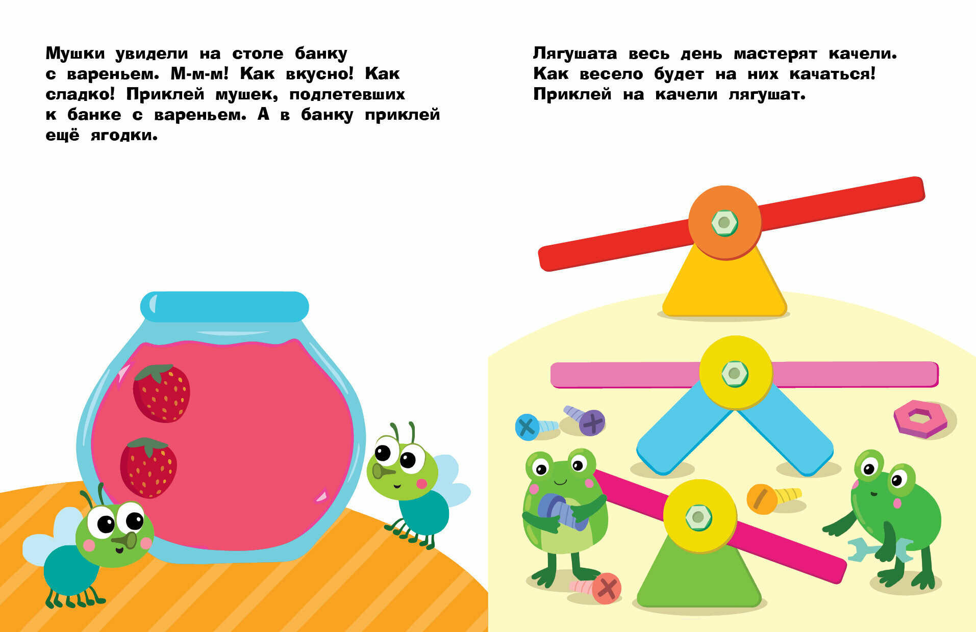 В данном журнале также, несмотря на тему, заявленную в названии и в оформлении обложки, иллюстрации и задания разноплановые. Каждый персонаж занят своим делом: мышки шьют, зайчик собирает урожай, муха отмечает именины, лягушки качаются на качелях и т.д. Никто не скучает. А ребенку предстоит помочь героям и разнообразить их работу при помощи наклеек.