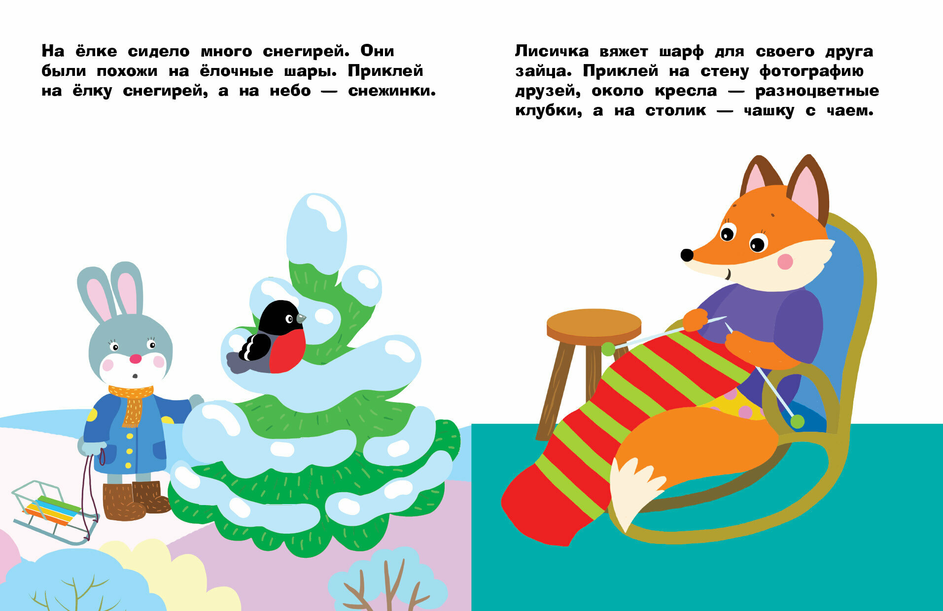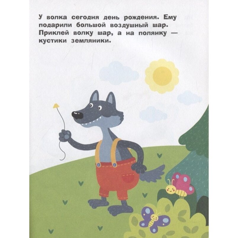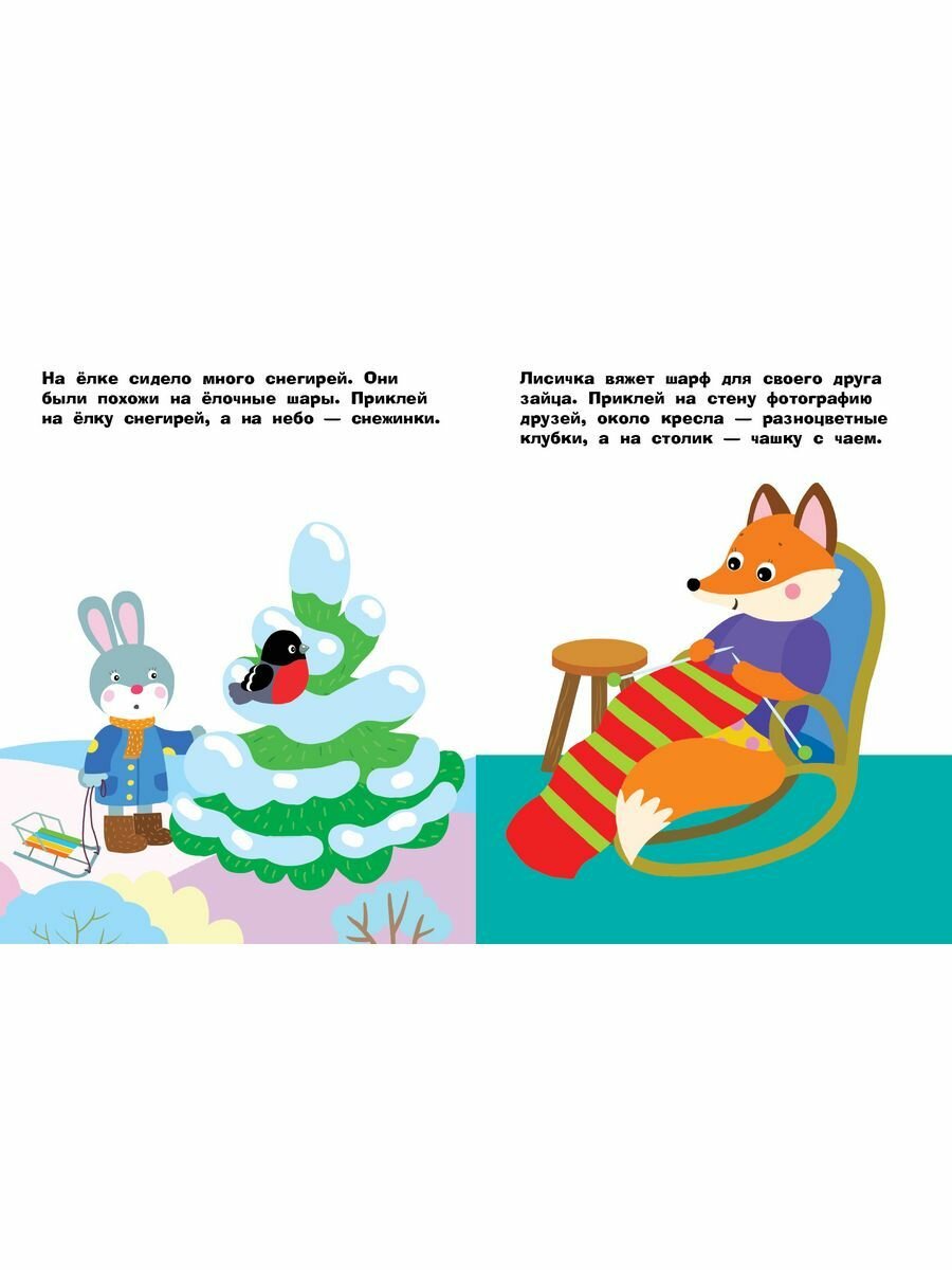 В данном альбоме иллюстрацци также идут на разные, не связанные межлу собой темы. Т. е. просто на каждой странице задание, для выполнения которого нужно выбрать и приклеить наклейки. В целом интересно. Ребенку очень понравилась картинка, где лиса вяжет шарф.