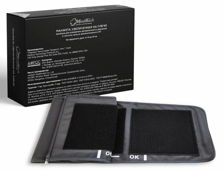 Увеличенная манжета для тонометра MediTech имеет размер в 32-45 сантиметра и подходит для пациентов с большим диаметром плеча. Выполнена из прочных и гипоаллергенных материалов.