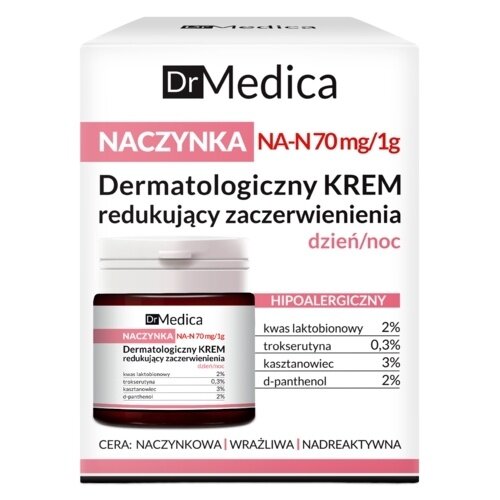 Для чувствительной кожи с куперозом. Дерматологический крем уменьшающий покраснения содержит специально разработанную формулу NA-N 70 mg/1g, которая состоит из активных ингредиентов, действующих целенаправленно на заметные куперозные изменения. Препарат уменьшает покраснения кожи, противодействует образованию новых „звездочек”, укрепляет эластичность стенок сосудов, повышая их устойчивость к повреждениям, эффективно уменьшает видимость капилляров, имеет успокаивающий эффект, снимает раздражения, снижает чувствительность и гиперреактивность кожи, интенсивно увлажняет тонкую куперозную кожу, предотвращает появление эритемы. Троксерутин, экстракт конского каштана активизируют микроциркуляцию крови, повышают прочность стенок сосудов и капилляров. Азелоглицин и декспантенол увлажняют, смягчают, осветляют. Дерматологически протестировано. Применение: Утром и вечером наносите крем массирующими движениями на очищенную кожу лица и зоны декольте. Избегать области вокруг глаз. Крем является отличной базой под макияж. При использовании днем защитить кожу от ультрафиолетового излучения.