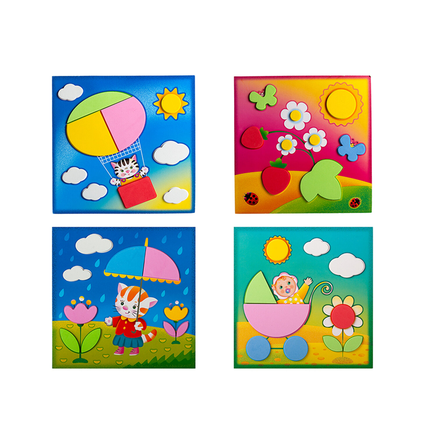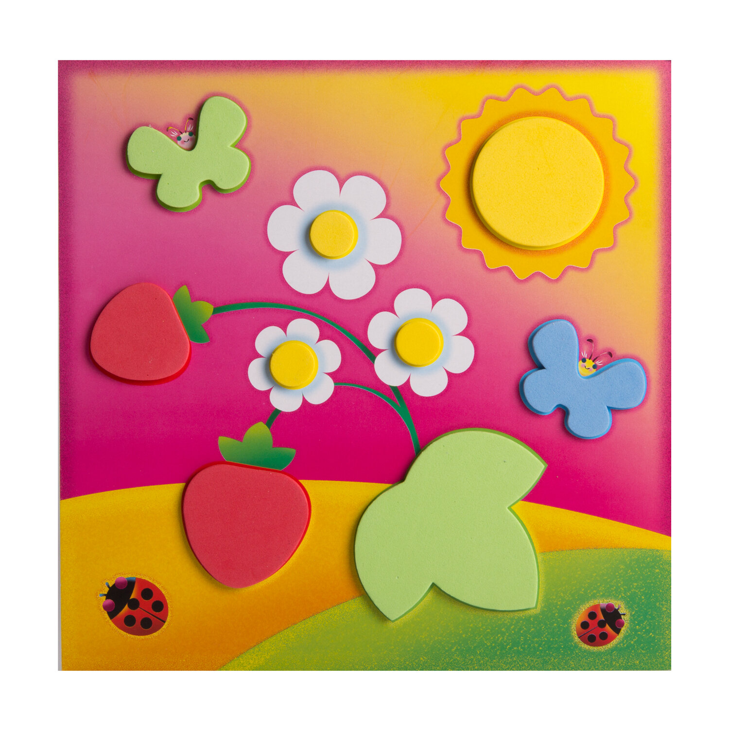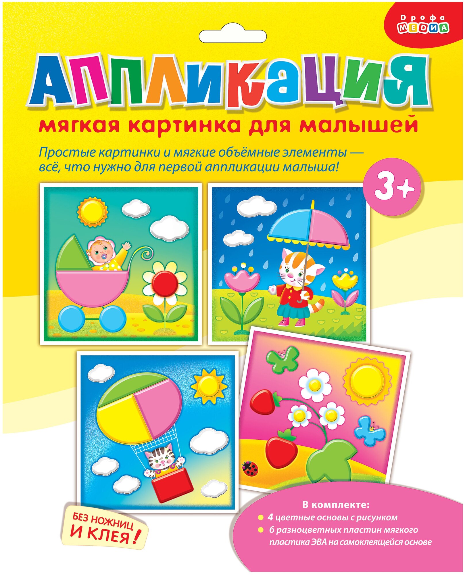 Яркая и выразительная аппликация с простыми и весёлыми картинками. Для работы не нужны ни клей, ни ножницы. В комплекте — мягкие детали, вырубленные из объёмного ЭВА на клеевой основе, которые легко приклеиваются на картинку-основу. Сама картинка небольшого размера, что поможет малышу легко справиться с работой. В результате получится прекрасная композиция — первая аппликация малыша! В наборе четыре яркие картинки. В наборе: — 4 цветные основы с рисунком, — детали из ЭВА на самоклеящейся основе (6 цветов), — глазки на самоклеящейся основе, — цветная листовка-образец. Возраст: от 3 лет. Размер аппликации: 20х20 см. Размер упаковки: 20х28х1 см.