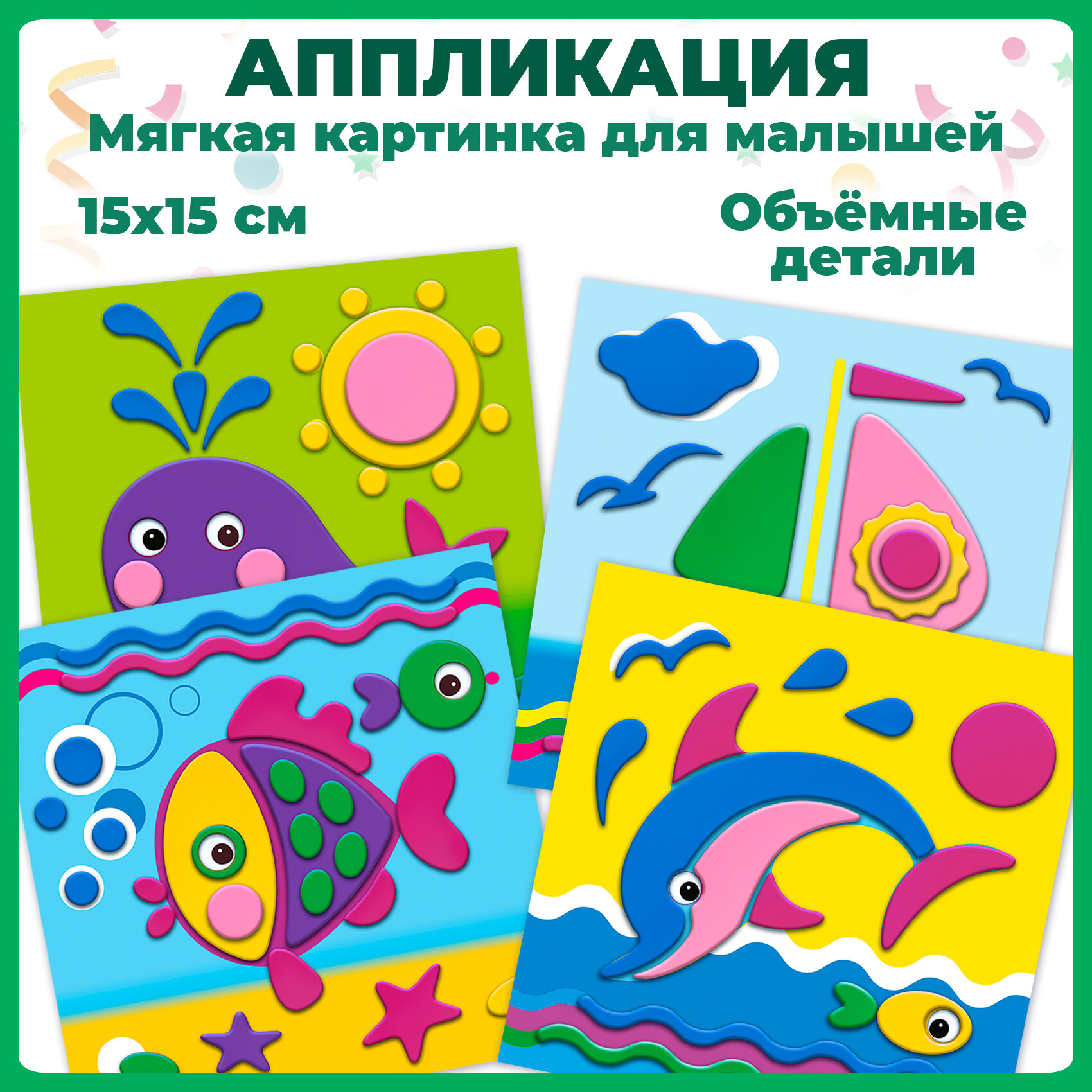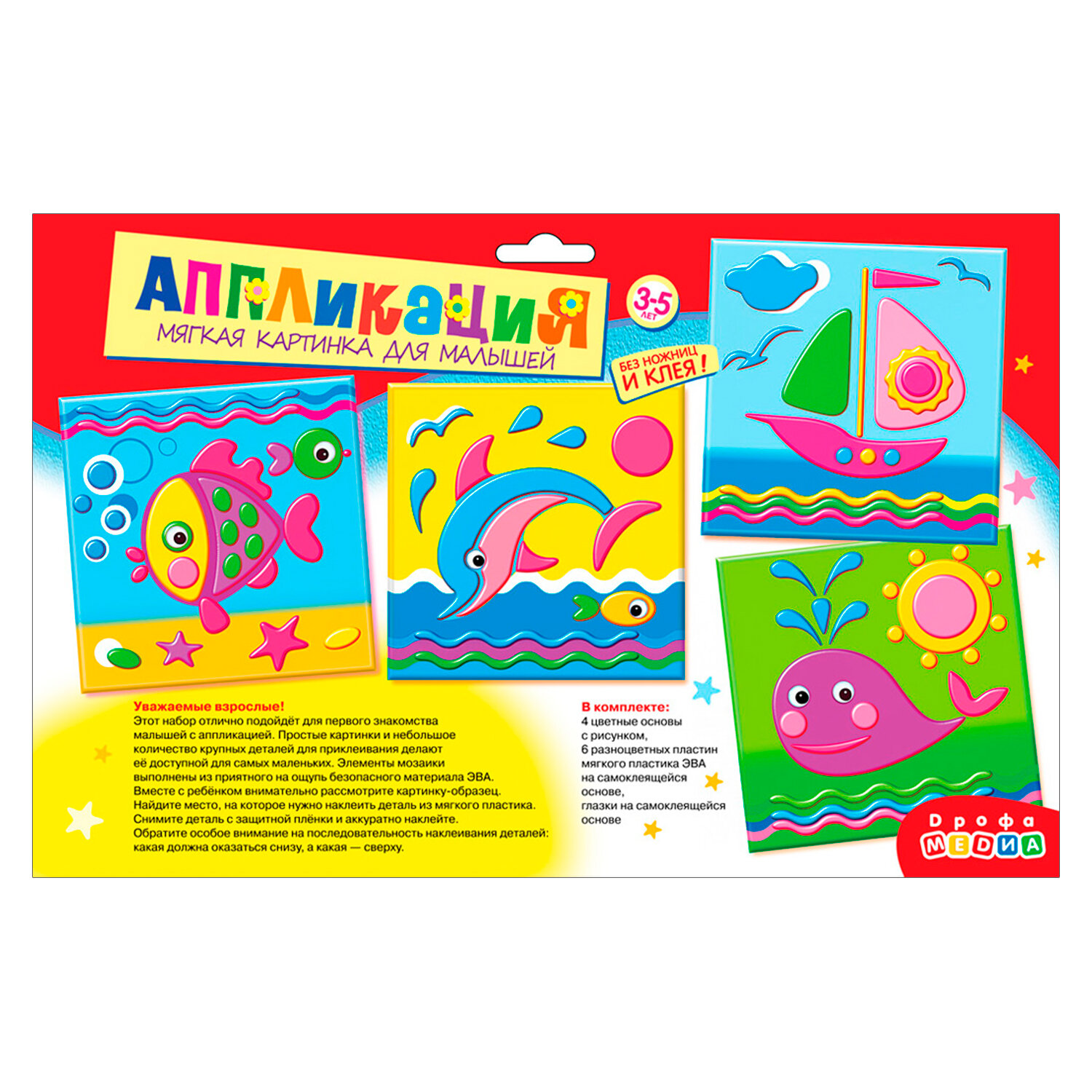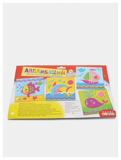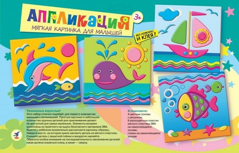 Аппликация — один из основных видов творчества для самых маленьких детей. Аппликация оказывает огромное влияние на развитие умственных и творческих способностей, мелкой моторики, внимательности и усидчивости.В нашем наборе вы найдёте всё, что нужно для создания забавной мягкой картинки: вам не понадобятся дополнительные материалы, клей или ножницы. Чтобы наклеить деталь, нужно просто снять с липкого слоя защитную плёнку и приложить деталь в нужное место картинки. Яркие, простые иллюстрации прекрасно подходят для первого знакомства малыша с аппликацией.Простые картинки и небольшое количество крупных деталей делают эту аппликацию понятной и доступной для малышей от 3 лет. Детали набора насыщенные и мягкие на ощупь, легко приклеиваются на картинку-основу. Несмотря на простоту исполнения, готовое изделие отличается красочностью, рельефностью и выразительностью. В наборе 4 аппликации.В наборе: — 4 цветные основы с рисунком-схемой, — детали из ЭВА на самоклеящейся основе (6 цветов), — декоративные элементы на самоклеящейся основе (глазки), — цветная листовка-образец.Возраст: от 3 до 5 лет.Размер аппликации: 15х15 см.Размер упаковки: 31х20х0,7 см.