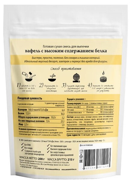 Вафли, смесь для выпечки от NEWA NutritionБыстро, просто, полезно. Без сахара и лишних калорий. С отрубями для хорошего пищеварения. С повышенным содержанием белка. Идеальный вкусный десерт, завтрак и перекус без вреда для фигуры. Из одной упаковки получается 400 граммов вафель. • Не содержит пшеничной муки • Не содержит искусственных ароматизаторов и красителей • Без ГМОИнструкция по применению1. В глубокой емкости тщательно перемешать смесь и воду(молоко) комнатной температуры2. Разогреть вафельницу (мультипекарь), предварительно смазать поверхность прибора небольшим количеством растительного масла при необходимости3. Выпекать до готовности 3-10 минут в зависимости от устройстваИнгредиенты:Рисовая мука, овсяные хлопья, сухое обезжиренное молоко, яичный белок, овсяные отруби, яичный меланж сухой, разрыхлитель , соль поваренная, ароматизатор пищевой, подсластители: стевиозид, сукралоза.
