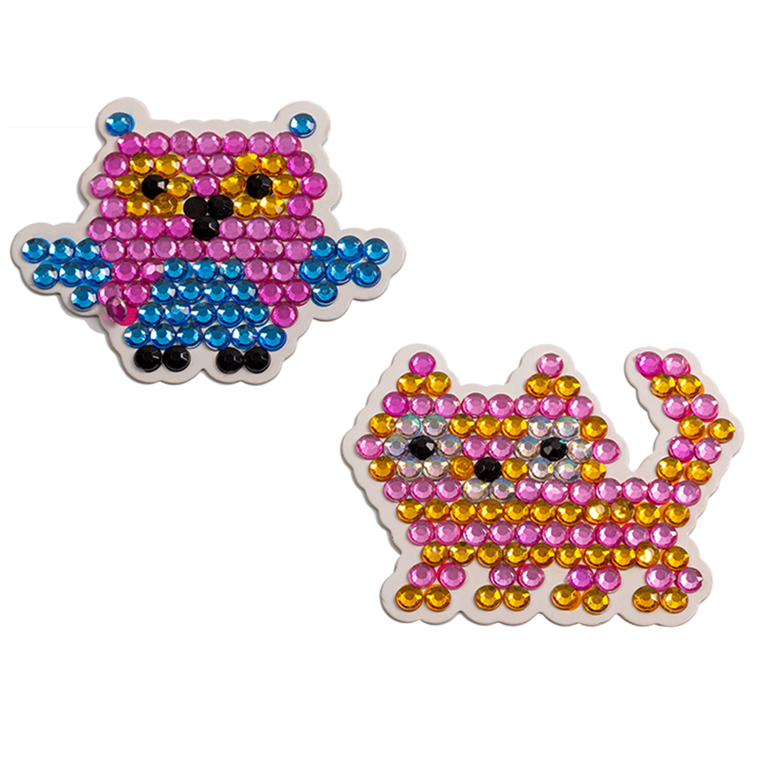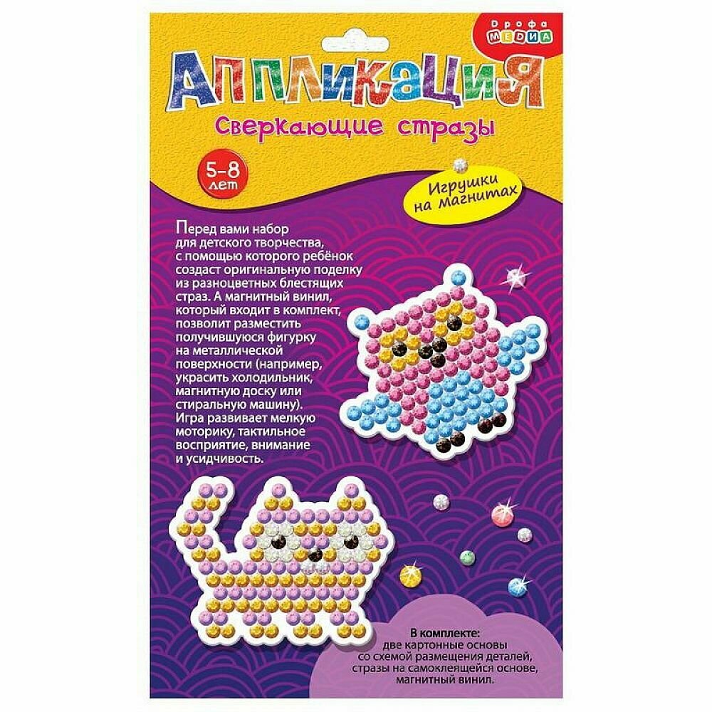 Если ребёнок любит аппликации и уже хорошо справляется с приклеиванием крупных деталей — самое время перейти на новый уровень. Для этого прекрасно подойдёт набор «Сверкающие стразы. Игрушки на магнитах». Наклеивание мелких деталей поможет ребёнку развить точность движений рук, стать более внимательным и усидчивым, а результат порадует глаз.В комплекте: — две картонные фигурки; — стразы на самоклеящейся основе; — магнитный винил.Возраст: от 5 лет.Материалы: картон, пластмасса, магнитный винил.Сделано в Китае.