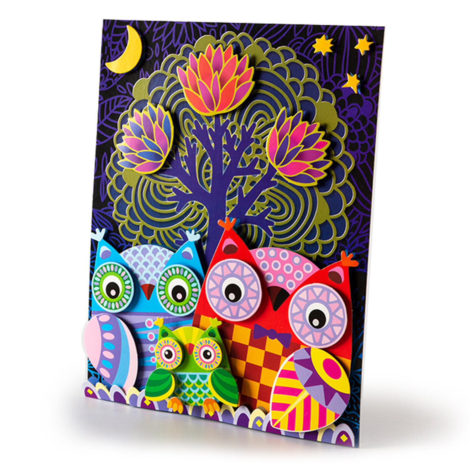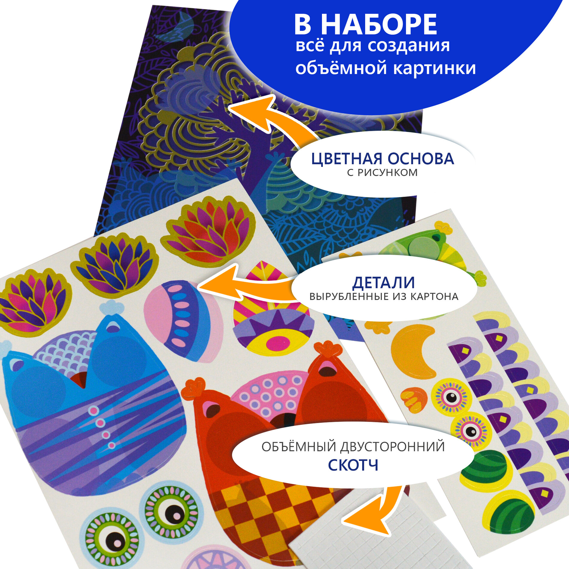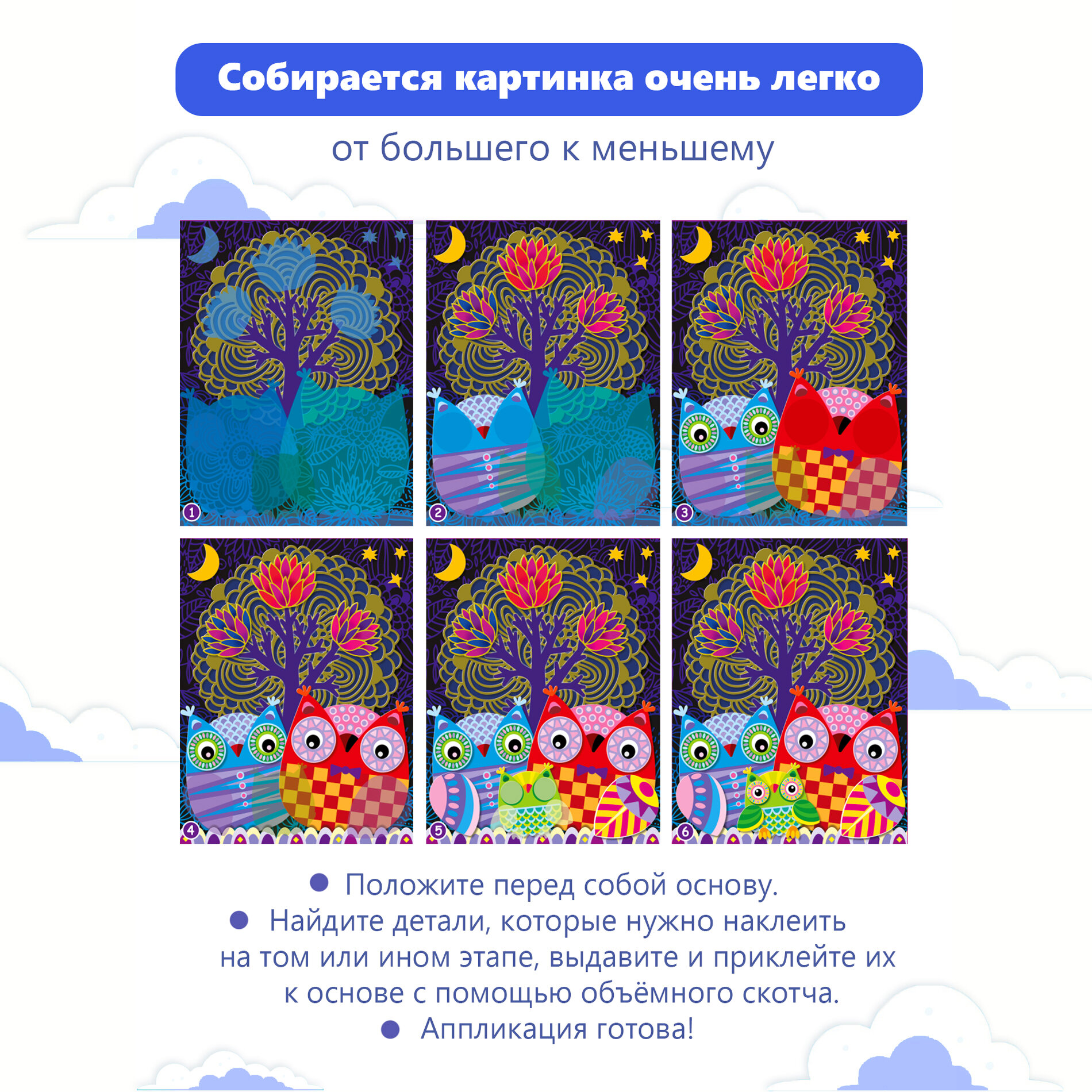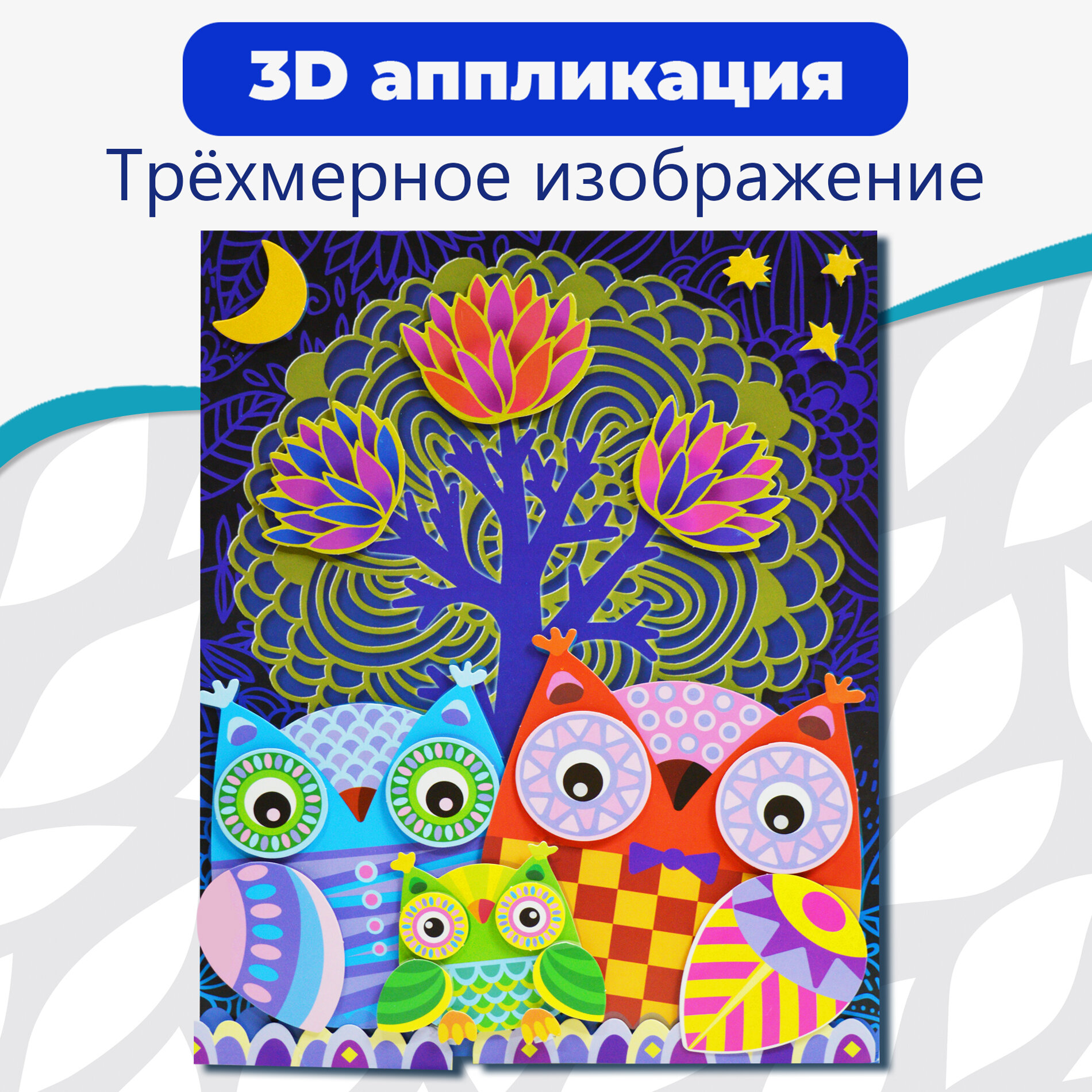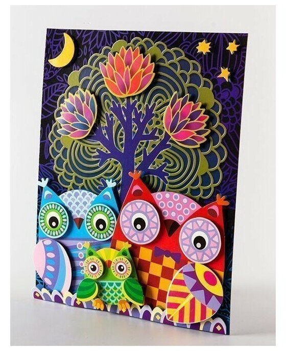 Разноцветная 3D аппликация – настоящая находка для домашней чудо-мастерской. Выполните вместе с непоседой рельефную картинку с симпатичным совиным семейством в ночном лесу!Что входит в комплект:прямоугольная основа из картона;два листа с вырубными деталями;маленькие квадратики двухстороннего скотча.Поделка без клеяВсе элементы аппликации вынимаются из картонных листов без усилий и специальных инструментов. Положите перед собой основу и наклеивайте детали в той последовательности, как это указано на рисунках-подсказках.Чем полезна объемная аппликацияТворческое занятие развлекает юного умельца и придает ему уверенности в себе. Маленький мастер учится аккуратности и внимательности, развивает мелкую моторику, координацию движений и воображение.Вставьте милую картину в рамку и повесьте в детской комнате!Параметры товара: основа 200х250 мм,детали от 10х10 мм до 115х110 мм, скотч 70х70 мм, упаковка – пластиковый пакет 205х300 мм, вес 85 г