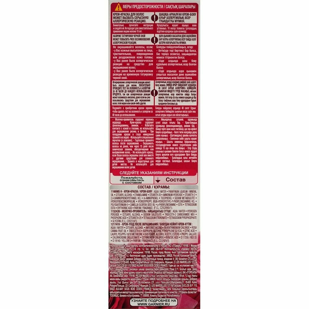 | Химический состав | Окрашивающий Крем: Aqua (Water, Eau), Cetearyl Alcohol, Ammonium Hydroxide, Coconut Alcohol, Sodium Laureth-6 Carboxylate, Sodium Myreth Sulfate, Succinic Acid, Bis- Diisopropanolamino-PG-Propyl Dimethicone/Bis-Isobutyl PEG-14 Copolymer, Ammonium Sulfate, Acrylamidopropyltrimonium Chloride/Acrylates Copolymer, Coco-Glucoside, Paraffinum Liquidum (Mineral Oil, Huile Minérale), Glyceryl Oleate, Arginine, Lysine HCl, Ceteareth-12, Ceteareth-20, Parfum (Fragrance), Sodium Sulfite, Potassium Hydroxide, Sodium Silicate, Toluene-2,5-Diamine Sulfate, Etidronic Acid, Ascorbic Acid, Resorcinol, Sodium Chloride, Butyloctanol, Citric Acid, Polysorbate 20, Linalool, Phenoxyethanol, Benzyl Salicylate, Hydroxyethyl-p-Phenylenediamine Sulfate, Lactic Acid, Citronellol, Geraniol, Limonene, Sodium Benzoate, m-Aminophenol, 2,4-Diaminophenoxyethanol HCl, Methylparaben, Ethylparaben, 4-Amino-2- Hydroxytoluene Проявляющая эмульсия: Aqua (Water, Eau), Hydrogen Peroxide, Cetearyl Alcohol, Propylene Glycol, Ceteareth-20, Steartrimonium Chloride, Paraffinum Liquidum (Mineral Oil, Huile Minérale), Etidronic Acid, 2,6-Dicarboxypyridine, Disodium Pyrophosphate, Potassium Hydroxide, Isopropyl Alcohol, Sodium Benzoate Ухаживающая маска для волос |