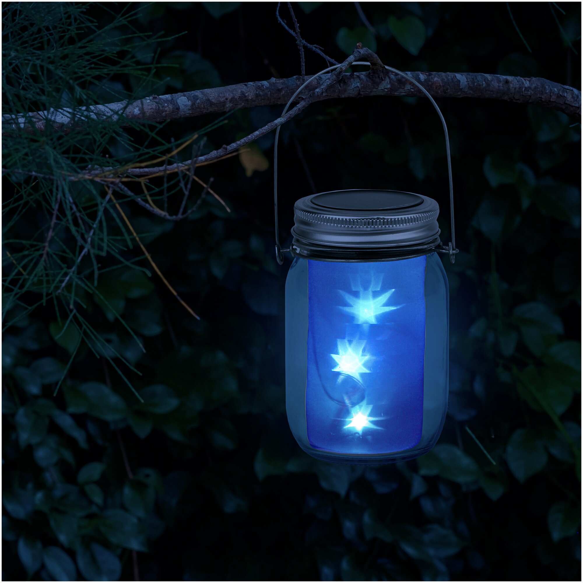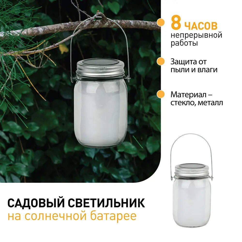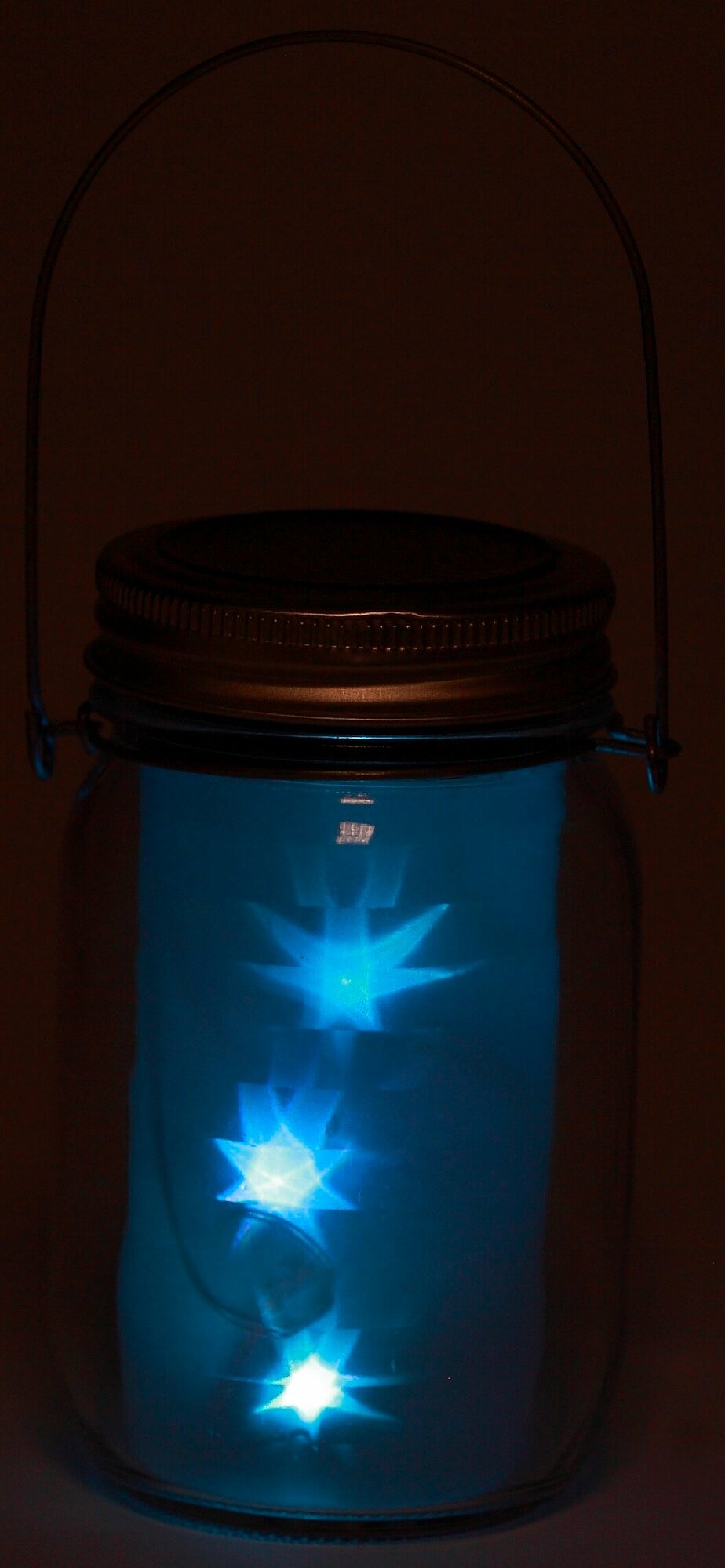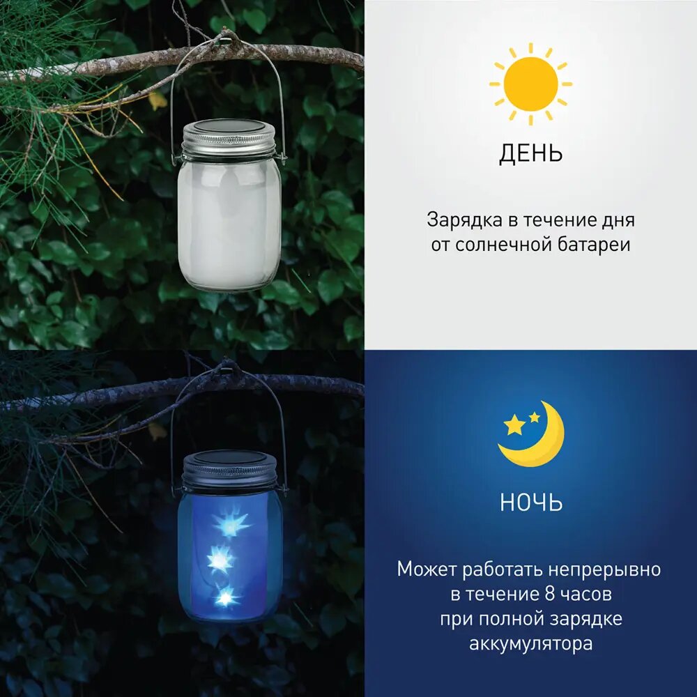 Светильник, стилизованный под банку с переливающимся узором внутри. Свет светодиодов преломляется декоративной сеткой, создавая впечатление меняющей цвет яркой мозаики. Солнечная панель на крышке банки, ручка для удобства переноски или для подвеса