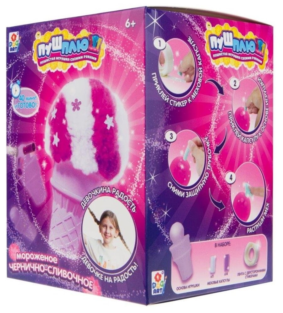Творческий игровой набор по созданию мягкого и плюшевого чернично-сливочного мороженого ассорти всего за 40 минут. Приклеивайте стикеры к меховой капсуле, прикрепите капсулу к основе в виде вафельного стаканчика с шариком мороженого, затем снимите защитные трубочки и распушите разноцветный мех..