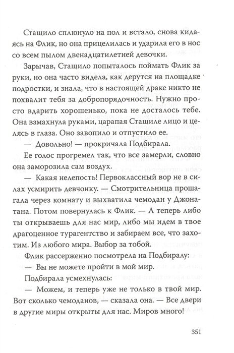 Двенадцатилетняя Флик считает себя самой обыкновенной девчонкой. И наверное, она никогда не узнала бы о своем чудесном даре, если бы случайно (впрочем, случайностей не бывает!) не заглянула в турагентство "Волшебные миры" и не познакомилась с его владельцем Джонатаном. Увидев в непрошеной гостье магические способности, он открывает ей тайну: оказывается, вокруг нашего мира существует множество других, фантастических миров! Все, что нужно сделать, чтобы отправиться в какой-нибудь из них, - это прыгнуть в нужный чемодан, а уж волшебных чемоданов у Джонатана не одна сотня. Однако не все благополучно в загадочной мультивселенной, и эту серьезную проблему может решить только Флик, обладающая уникальным даром...