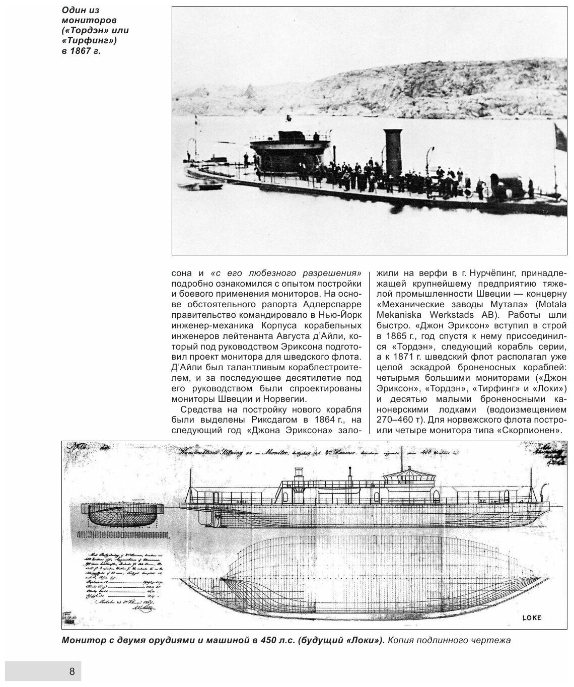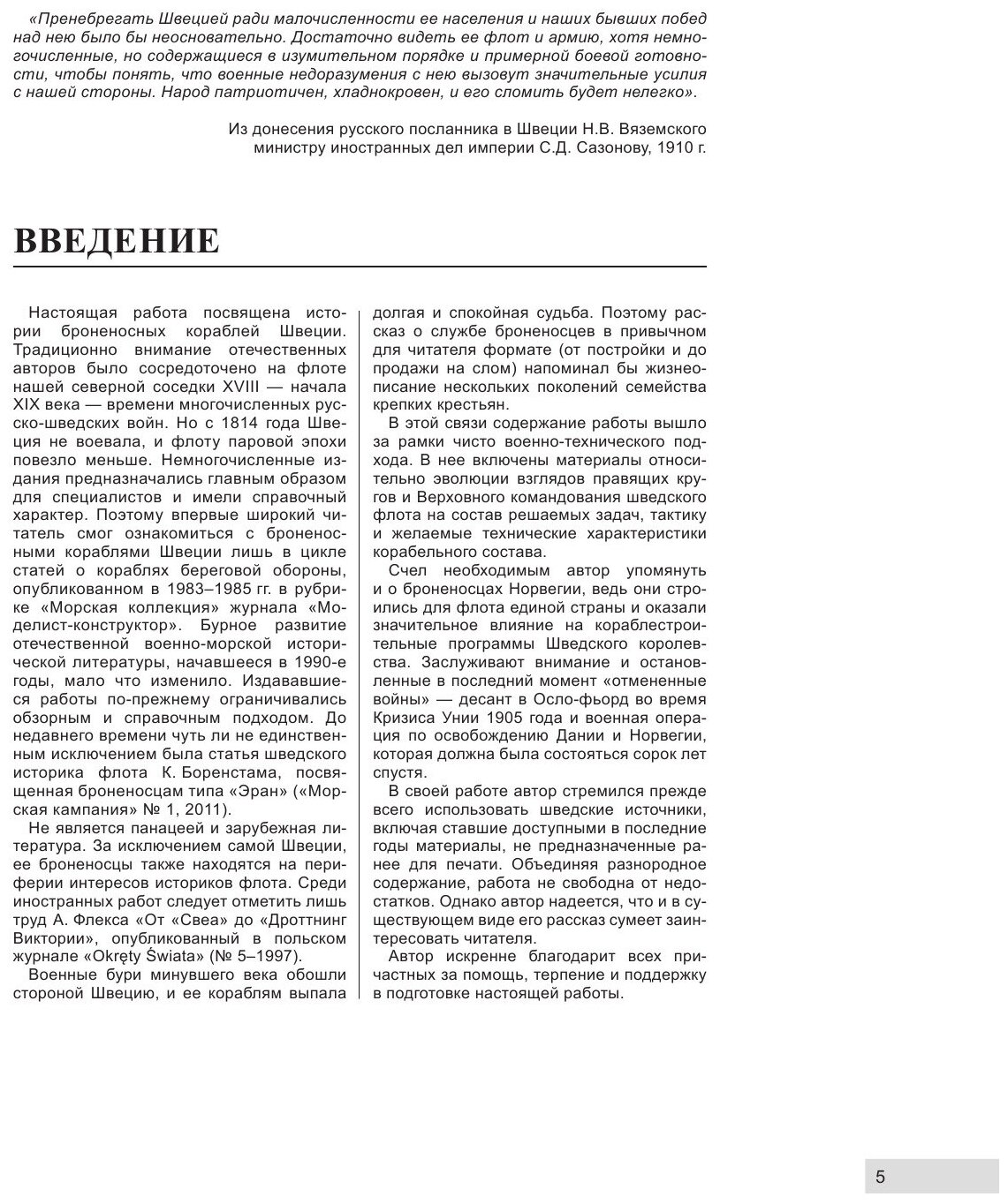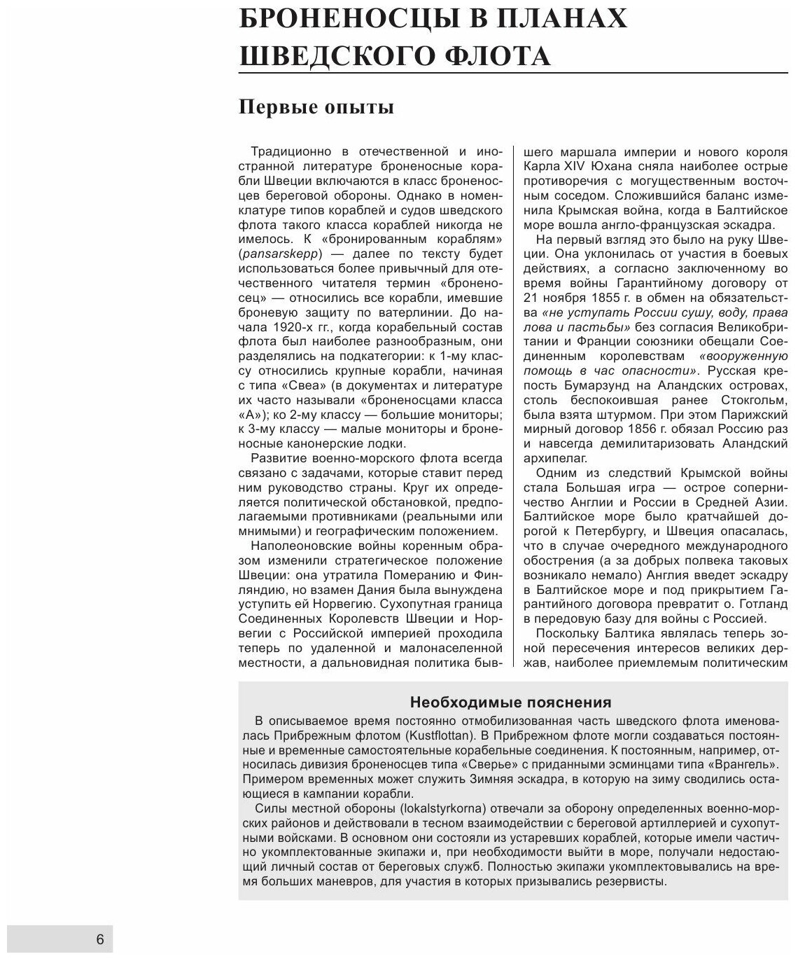 Если попытаться создать типичную корабельную монографию, где будет расписываться история создания, технические особенности проекта и история службы корабля, то подавляющее большинство читателей, хоть и интересуются флотом, не обратят внимания на такую книгу. В случае с рассматриваемой книгой, автор, по-моему, блестяще решил эту непростую задачу. Он сам во введении говорит, что простое описание ТТХ кораблей при невзрачной истории службы может быть интересна только самим шведам. Тогда он добавил в книгу разделы об эволюции броненосного судостроения в Швеции с 1870-ых до 1945 гг. (стр. 6 – 35) и попыток боевого использования (стр. 113 – 122). Кроме того, что автор умеет популярно писать, и его книга читается легко и быстро, нужно отметить, что указанные главы оказываются не просто интересными, их полезно знать интересующимся историей, и уж точно тем, кто занимается историей Швеции. Читающие отзыв, наверняка уже обратили внимание на фразу «боевое использование». – Что, шведы успели где-то повоевать? – Нет, их броненосцы не сделали ни одного выстрела по противнику. Но оказывается, у Швеции были мнимые и реальные противники, что приводило порой к обострению политической обстановки.
