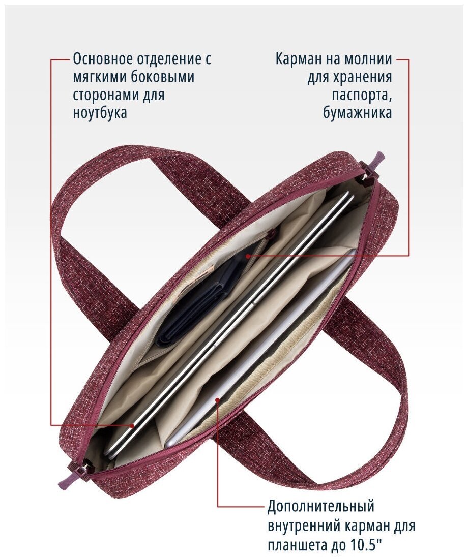 Стильная сумка из высококачественной, водоотталкивающей ткани.• Легкая, но имеет утолщенные стенки для защиты ноутбука от случайных ударов и царапин, а также от пыли и влаги.• Основное отделение для ноутбука 13.3-14" имеет также два внутренних отделения - для планшета до 10.5" и документов.• Два внешних отделения на молнии для хранения аксессуаров, визитных карт, смартфона.• Двойная застежка молния для удобного доступа к устройству.• Удобные ручки для переноски и наплечный ремень помогут чувствовать себя комфортно в самом долгом путешествии.