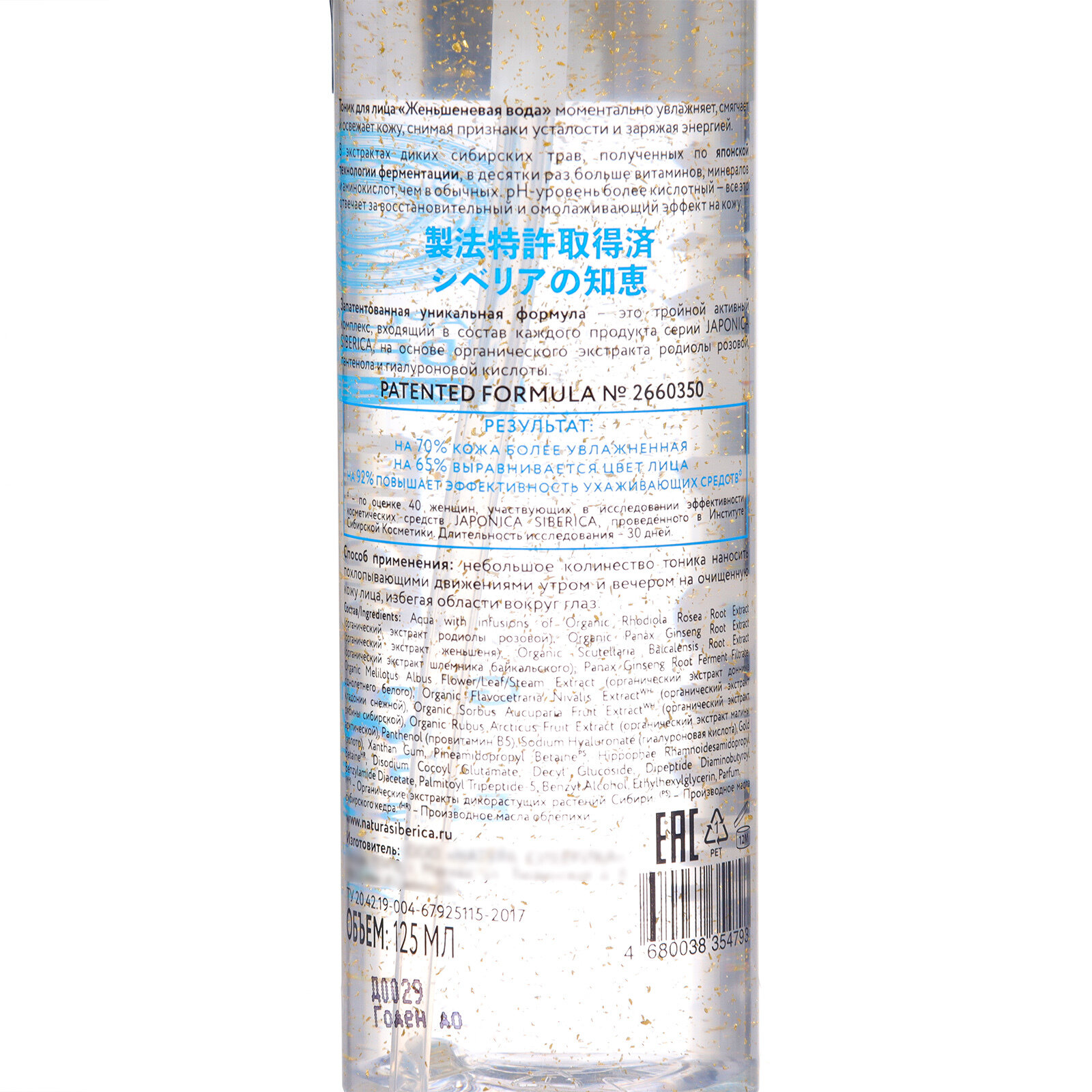 | Состав | аква с инфузий; органический экстракт родиолы розовой; органический экстракт женьшеня; органический экстракт корня шлемника байкальского; женьшень корень фермент фильтрат; органический экстракт донника белого однолетнего; органический экстракт кладонии снежной; органические рябина обыкновенная плоды extractwh; гиалуроновая кислота; золото; ксантановая камедь; пинеамидопропилбетаинепс; рамноидесамидопропилбетаинепс гиппофа; глутамат динатриевого кокоила; децилглюкозид; дипептид диаминобутироил бензиламид диацетат; пальмитоил трипептид-5; бензиловый спирт; этилгексилглицерин; парфюмированная вода |
