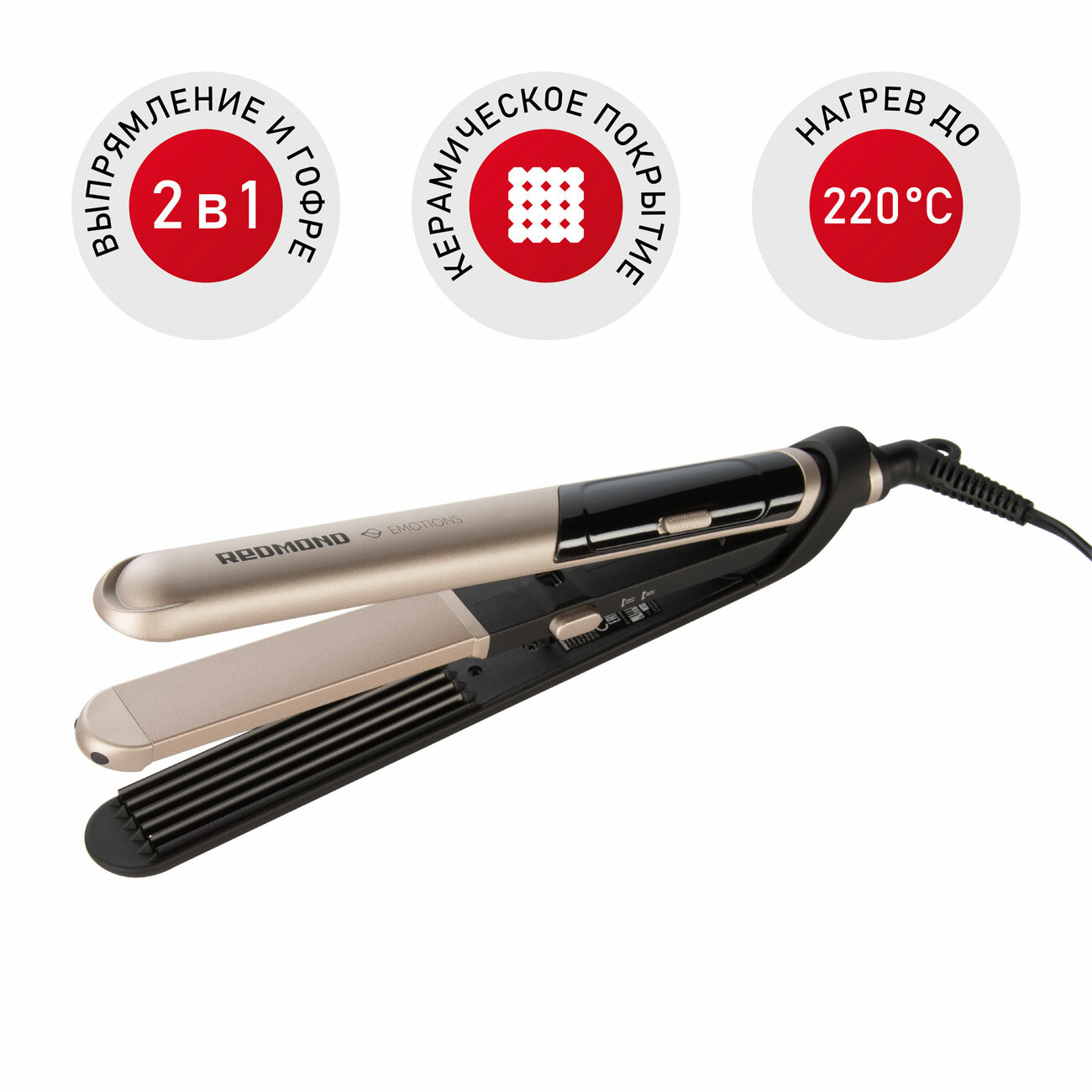 | Прочие особенности и свойства | Стайлер REDMOND RCI-2335 «2 в 1» выполняет функцию сразу двух приборов для укладки волос – утюжка для выпрямления и щипцов для создания волн гофре., Насадка для выпрямления волос, насадка-гофре., Один режим работы. , Максимальная температура 220°С., Керамическое покрытие., Вращение шнура., Кольцо для подвешивания. |