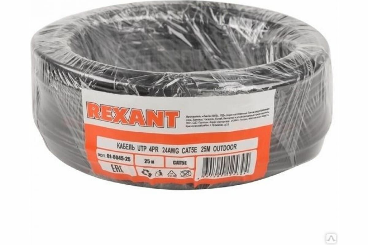 Кабель UTP 4PR 24AWG, CAT5e, наружный (OUTDOOR) (бухта 25 м) REXANT. Неэкранированная витая пара, материал проводника высокоочищенная бескислородная медь, калибр (24 AWG). Материал оболочки — ПЭ (PE).