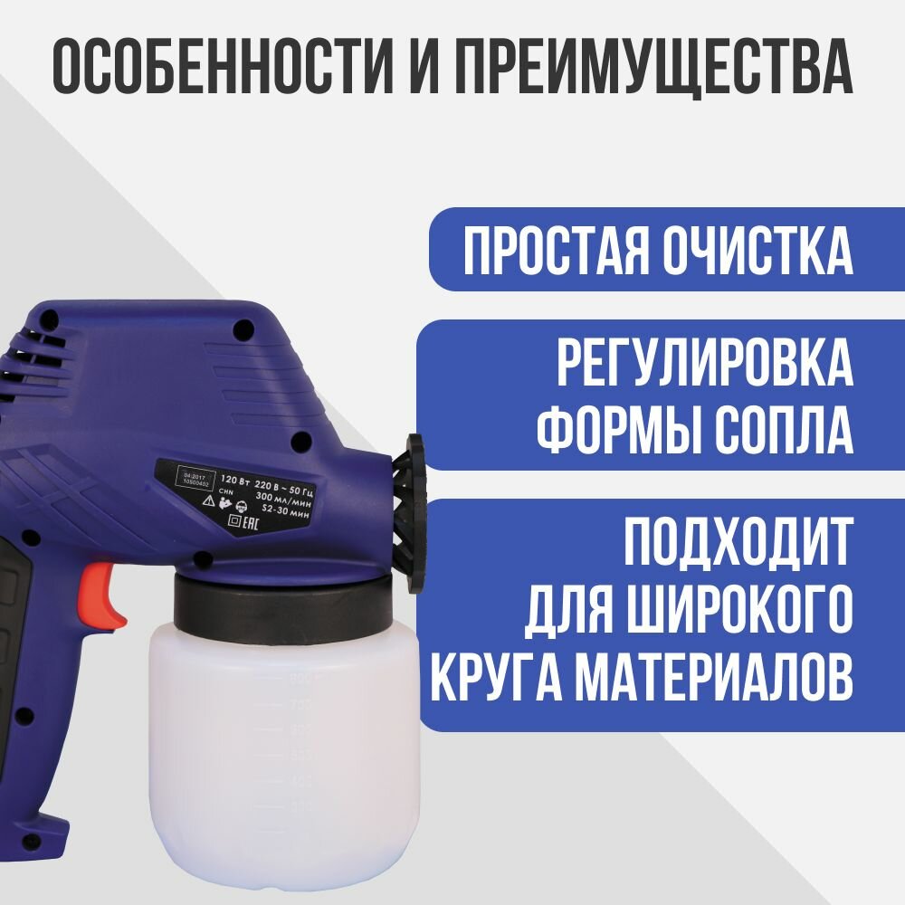 Краскораспылитель работает от сети переменного тока напряжением 220 В, частотой 50 Гц.