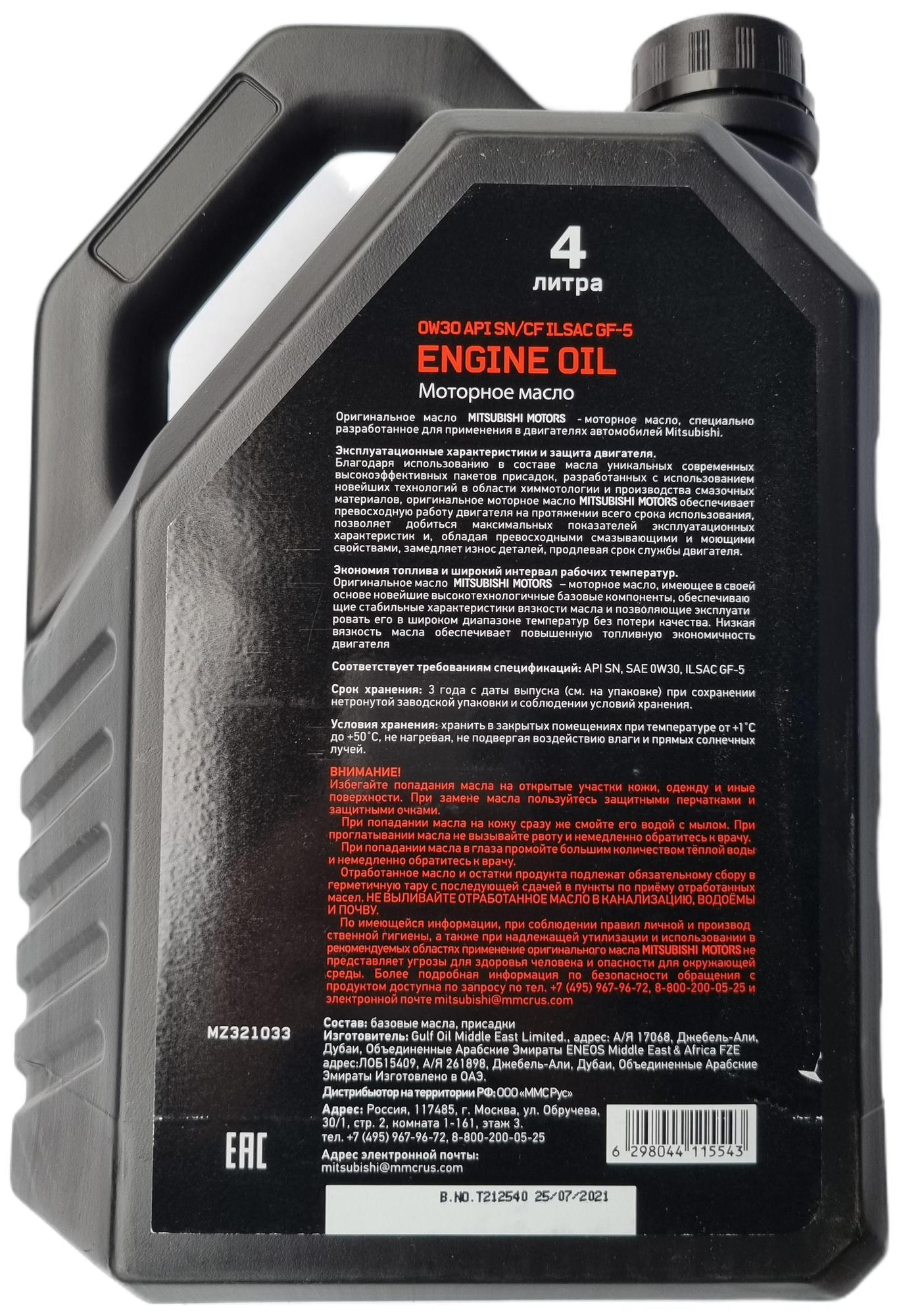 Высококачественное энергосберегающее синтетическое моторное масло, обладает высокими противоизносными свойствамиБлагодаря изначальной малой вязкости, обеспечивает следующие преимущества:• увеличение КПД двигателя и экономия топлива - в отличие от традиционных моторных масел, обладающих высокой вязкостью, маловязкое масло Mitsubishi Motors не отнимает у двигателя много энергии (а соответственно – топлива) на его прокачку по масляной системе.• превосходный «холодный пуск» - благодаря использованию современных синтетических базовых компонентов и высокоэффективных присадок, маловязкое масло сохраняет хорошую текучесть при низких температурах, что гарантирует отсутствие проблем с пуском двигателя даже в самую холодную зиму.• великолепная защита двигателя – маловязкое масло быстро циркулирует по масляной системе ДВС, эффективно смазывая, очищая и отводя излишнее тепло из всех, даже самых труднодоступных частей двигателя. Уникальные пакеты современных присадок обеспечивают непревзойдённую защиту всех трущихся поверхностей, образуя прочные масляные плёнки на трущихся поверхностях.• Рекомендуется для использования в бензиновых двигателях следующих моделей автомобилей Mitsubishi: Pajero IV, Pajero Sport, ASX, Outlander, Lancer, Colt и Grandis.
