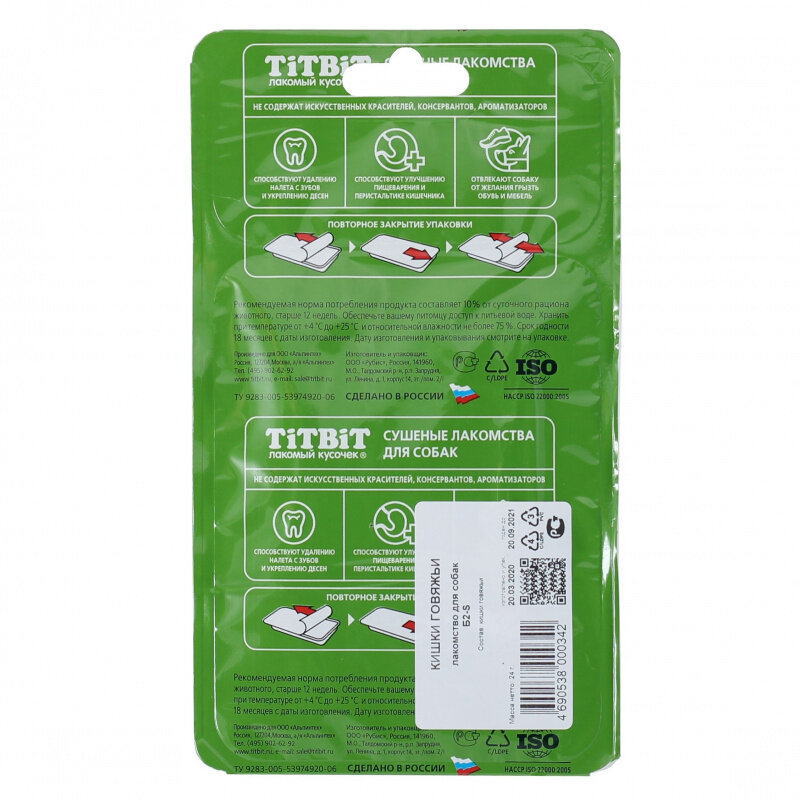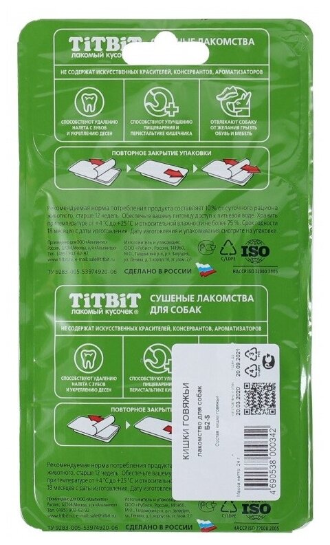 Лакомство для собак Кишки говяжьи TiTBiT - это полезный и натуральный продукт. Высушенные кишки порезаны на отрезки длиной 11 см. Вкусняшки содержат кальций(Ca), магний(Mg), фосфор(P) и полезны для стимуляции пищеварения. Очищают зубы от пищевого налета и зубного камня. Лакомства для собак TiTBiT производятся только в России, из высококачественного сырья, поставляемого Российскими фермерскими хозяйствами. Нас выбирают 8 000 000 заботливых владельцев. Производство сертифицировано по международным стандартам HACCP ISO 22000:2005 в области безопасности пищевой продукции.