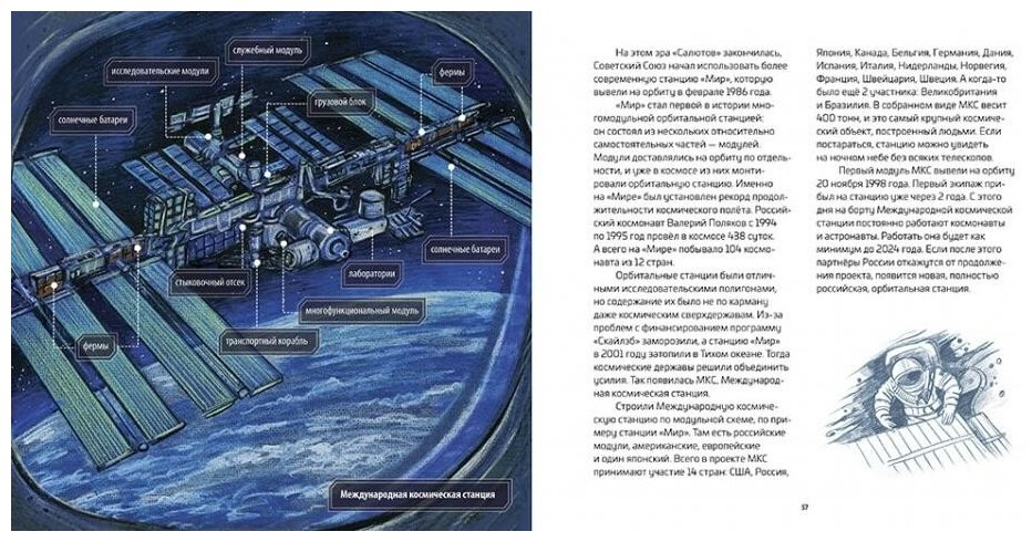 Книгу заказала накануне великого для нашей страны события-60- летия со дня выхода человека в космос. Читаем с дочкой восьми лет, ей очень нравится. Некоторые вещи знали ранее, но есть и информация, которую только удавалось иногда услышать в новостях, о событиях, происходящих в настоящее время в космической сфере. Поэтому книга не только своевременная, актуальная, но и очень увлекательная. Мне только показалось странным, что Сергею Павловичу Королёву в книге уделено очень мало места- на 42 странице небольшой абзац и 2-3 предложения по всей книге. Зато Роберту Годдарту отведена целая страница с рисунком и информацией и ещё один большой абзац на странице рядом. Как-то не справедливо по-моему... Хотя, возможно, автор сделал это именно для того, чтобы мы узнали об этом учёном. Лично я о нём раньше не знала. Очень понравились иллюстрации художника Фёдора Владимирова. Ещё очень понравилось то, что автор в своей книге упоминает художественную литературу и художественные фильмы на тему космоса, это ближайшая точка развития любого, кто прочитает эту книгу. А ребёнку показалось очень забавным, что на борту космического корабля "Юнона" полетели LEGO- "астронавты".