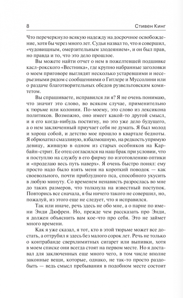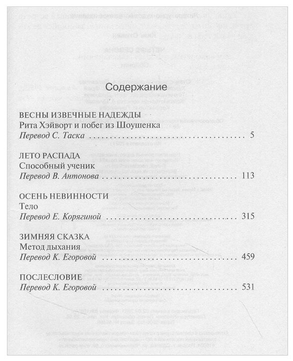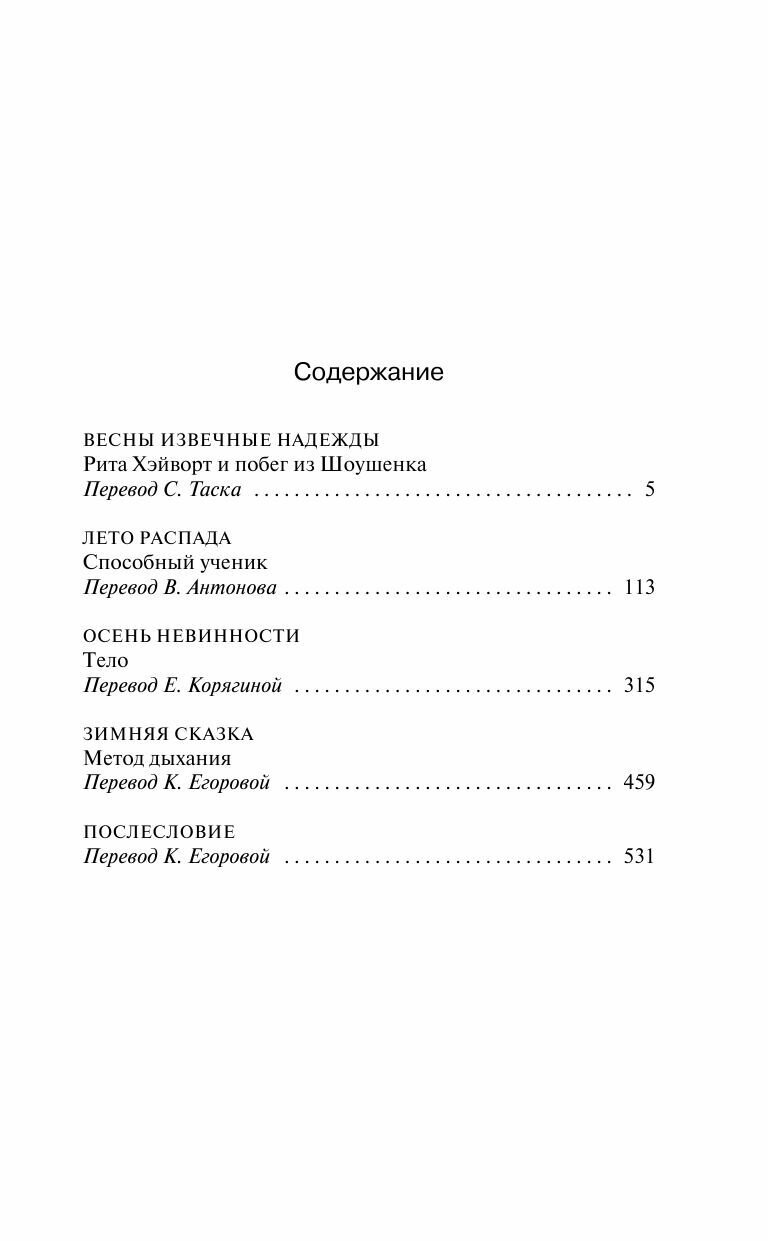 Странно, что так мало отзывов ведь это легендарный сборник Стивена Кинга. Я обожаю его за то, как он придумывает к ним интересные концепции. В этот раз четыре сезона. По истории на каждый. И каждая окажется созвучна тому сезону, по которому названа. Стоит ли читать? Однозначно. Ведь истории здесь одни из его самых сильных (по \"Побегу из Шоушенка\" даже в театре пьесы ставят), в том числе по моральному аспекту и раскрывающимся в них темах. Здесь нет таких ужасов, как в других его произведениях, но они точно тронут вашу душу, пусть и иным образом