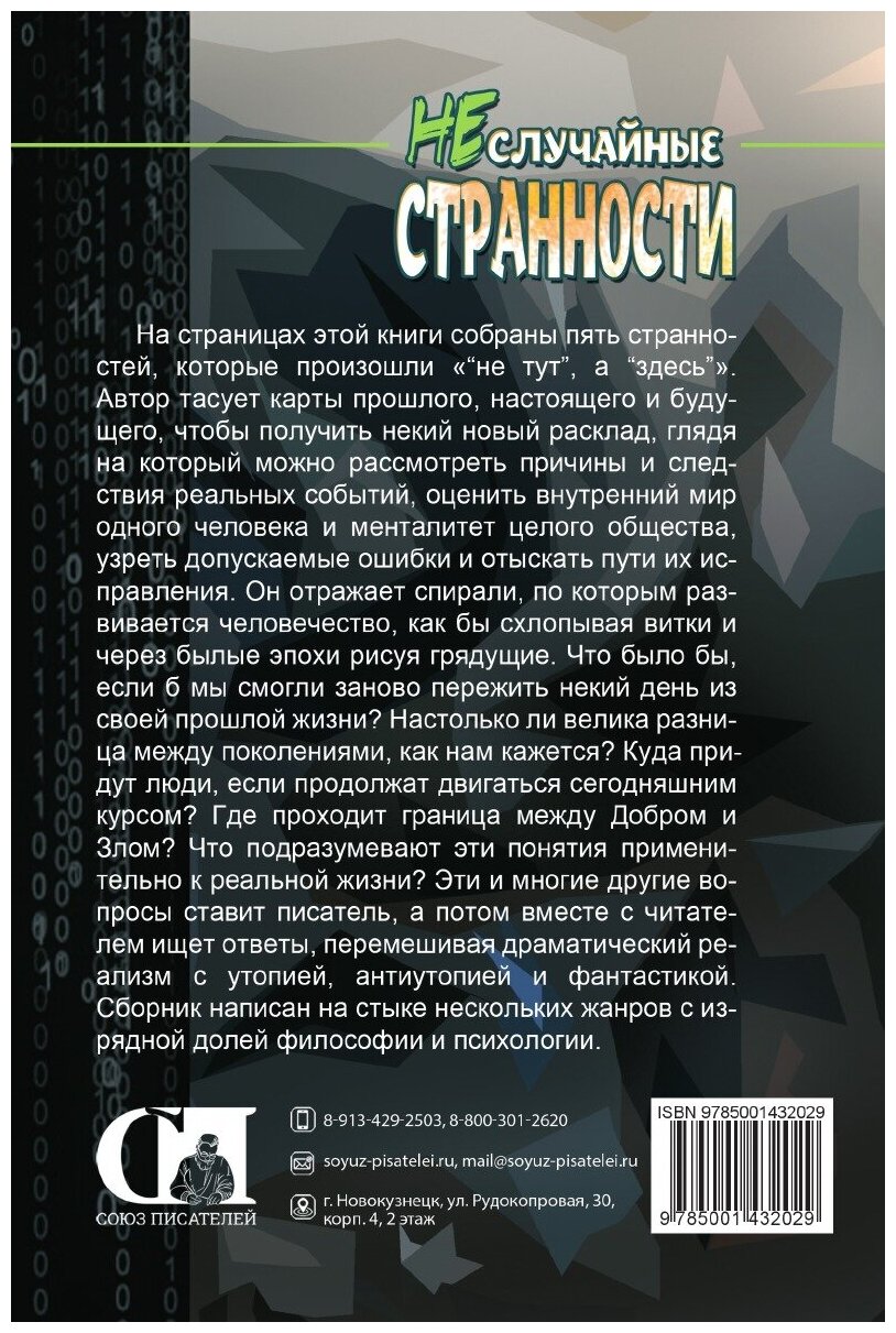 Книга «Неслучайные странности» не относится к категории развлекательного чтения, это не яркая, не динамичная история полная банальностей… это философское произведение с глубоким смыслом. Данный сборник заставляет задуматься о смысле нашего существования, что мы собой представляем не только сейчас, но и вчера и завтра. Книга довольно сложная, но на мой взгляд, необходимая для нынешнего поколения. Мы живем во время цифровых технологий, когда с телефона можно управлять пылесосом, чайником и т. д. и поэтому многие погрузились в свой виртуальный мирок, не задумываясь не о прошлом, не о том к чему это может привести. Автор стирает границы времени, перемещаясь то в прошлое, то в будущие, тем самым, показывая нам, к чему может привести наше безразличие к истории. Семья, дружба, добро и зло – это основные и важные темы, которые затрагивает автор в своем сборнике. Книга проникает в самую глубину души, потому что заставляет задуматься, а не умиляться очередной наивной истории.