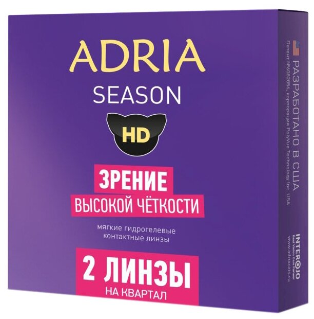 ADRIA Season (Адриа Сизон) Контактные линзы ADRIA Season - проверенные временем линзы на квартал.В упаковке ADRIA Season 2 pack - 2 штуки (рассчитана на 3 месяца ношения)В упаковке ADRIA Season 4 pack - 4 штуки (рассчитана на 6 месяцев ношения)Преимущества ADRIA Season:Выгодно. Стоимость одного дня ношения - чуть больше 5 рублей.Качественный материал. Линза остается чистой даже при длительном ношении, сохраняя прочность и гибкость.Тонкий край линзы - удобство уже при надевании. А для дополнительного комфорта в буферный раствор мы добавляем увлажнитель - гиалуроновую кислоту. HD-качество зрения. Линзы созданы по американской запатентованной технологии High Definition vision. Уникальный дизайн передней поверхности линзы обеспечивает повышенную контрастность и ясность зрения в любое время суток и при любых освещениях, даже в сумерках.Универсальность. Радиус базовой кривизны линзы - 8,6 мм. Подходит для глаз более 82% населения России.Режим ношения: дневной