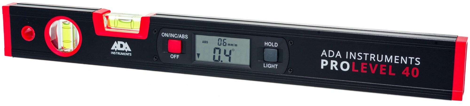 | Дополнительно | Цифровой уровень ADA ProLevel 40 для измерения углов наклона деталей и плоскостей. Удобно читаемый цифровой электронный дисплей отображает отклонение от горизонтали/вертикали, получая данные с встроенного датчика уклона (инклинометра). Для точной работы есть автоматическая калибровка. Данные отображаются в градусах, мм/м, %, in/ft. Результаты в градусах отображаются крупными цифрами постоянно, а мм/м или % отображаются на выбор в верхней строке. Наклон можно видеть одновременно в двух единицах измерения. Для удобства работы есть режим “HOLD” - удержания результатов на дисплее и подсветка. При измерениях над головой цифры на экране автоматически переворачиваются. , Встроенные пузырьковые уровни позволяют вести двойной контроль совместно с электронным датчиком уклона или работать как с обычным уровнем. В основание встроены магниты для крепления на стальных конструкция. Отличный выбор для разных работ как внутри помещений, так и снаружи., , Функции, Автоматическая калибровка, ЖК экран с подсветкой, Магниты в основании, Автоматическое отключение, , Комплектация: прибор, батарея, инструкция, , Технические характеристики:, Рабочий диапазон, ° 4х90, Точность наклона 0,2°, Разрешение, ° 0,1, Питание/время работы 2xAAA, 1.5 В, Указание направления угла v, Фиксация результатов на дисплее v, Магнитное крепление v, Автоотключение при отсутствии действий через 5 минут |