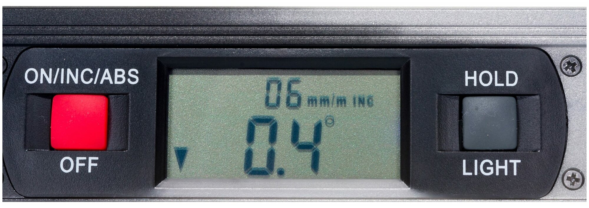 Цифровой уровень ADA ProLevel для измерения углов наклона деталей и плоскостей. Удобно читаемый цифровой электронный дисплей отображает отклонение от горизонтали/вертикали, получая данные с встроенного датчика уклона (инклинометра). Для точной работы есть автоматическая калибровка. Данные отображаются в градусах, мм/м, %, in/ft. Результаты в градусах отображаются крупными цифрами постоянно, а мм/м или % отображаются на выбор в верхней строке. Наклон можно видеть одновременно в двух единицах измерения. Для удобства работы есть режим “HOLD” - удержания результатов на дисплее и подсветка. При измерениях над головой цифры на экране автоматически переворачиваются.