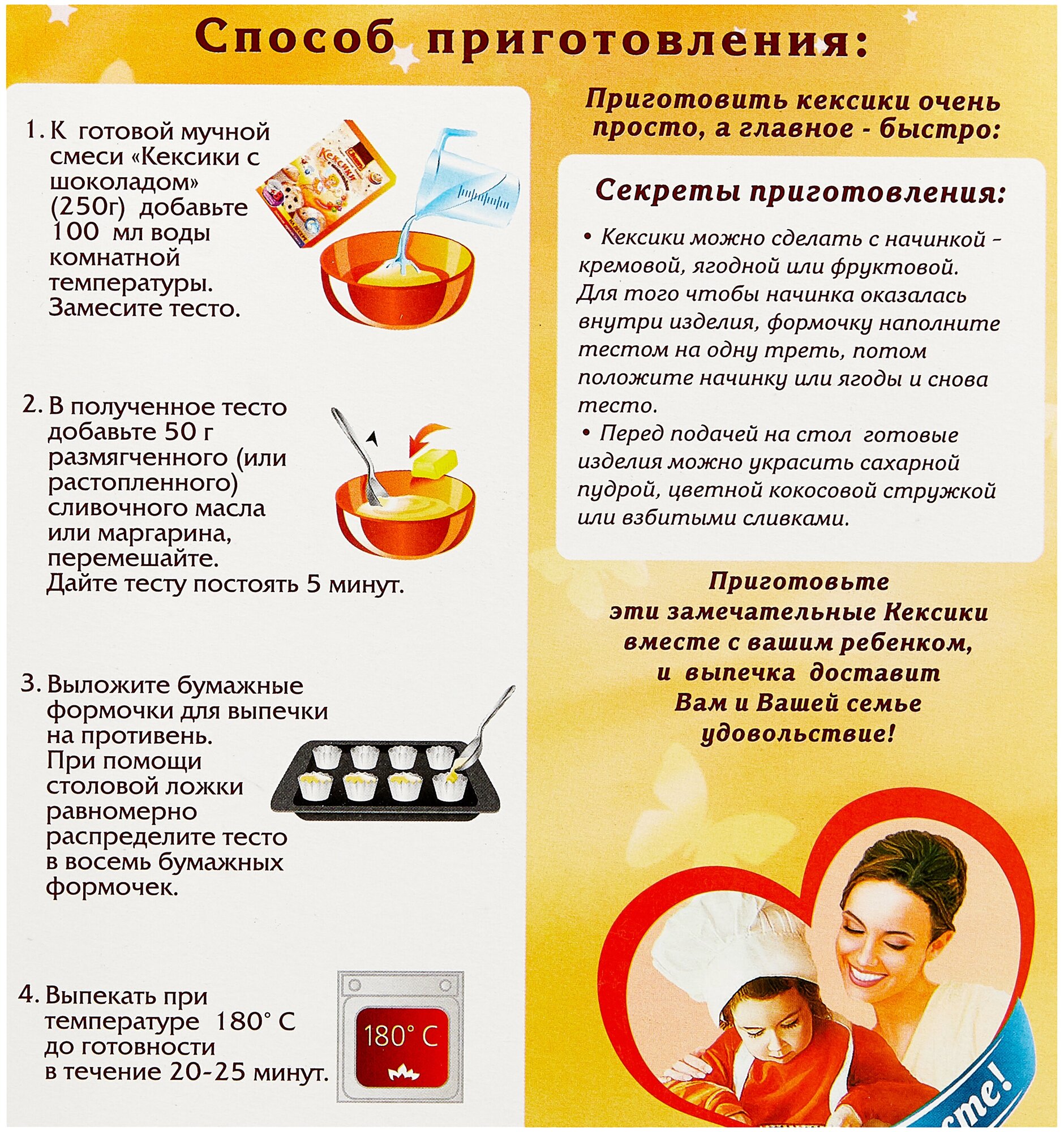 Кексики с шоколадом – великолепный выбор для приготовления в домашних условиях изысканной выпечки. Готовые мучные смеси для приготовления нежнейших кексиков по принципу «Только добавь воды». В упаковки вложено по восемь бумажных формочек для выпечки. Благодаря простоте, такой десерт сможет приготовить даже ребенок. В каждой коробке идет картинка-раскраска.
