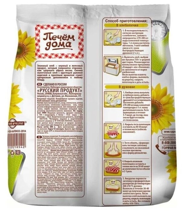 | Состав | мука пшеничная в/с, смесь зерновая (семена подсолнечника, овес плющеный, семена тыквы, отруби пшеничные, закваска сухая), сахар, мука ржаная обдирная, соль, семена льна, клейковина пшеничная, солодовый экстракт, ячменная солодовая мука, регулятор кислотности-кислота лимонная |