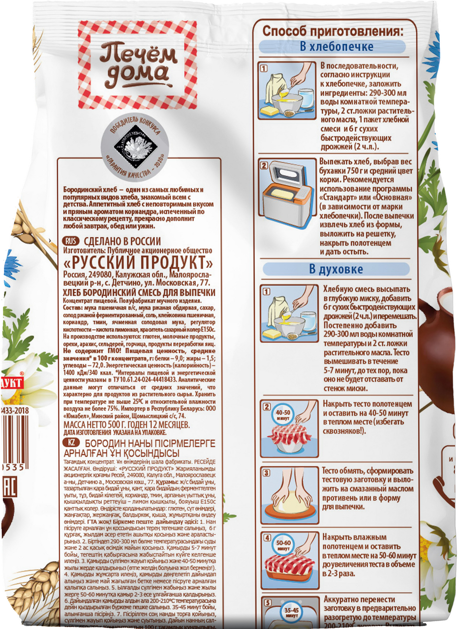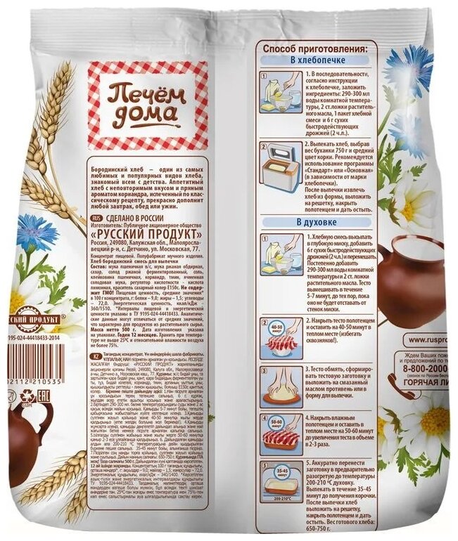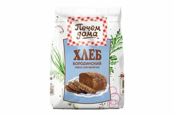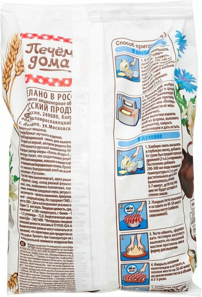 Описание товара:Бородинский хлеб - один из самых любимых и популярных видов хлеба, знакомый всем с детства. Аппетитный бородинский хлеб "ПЕЧЕМ ДОМА" с неповторимым вкусом и пряным ароматом кориандра, испеченный по классическому рецепту, прекрасно дополнит любой завтрак, обед или ужин.Состав товара:Мука пшеничная в/с, мука ржаная обдирная, сахар, солод ржаной ферментированный, соль, клейковина пшеничная, кориандр, тмин, ячменная солодовая мука, регулятор кислотности - кислота лимонная, краситель сахарный колер Е150с.Способ приготовления:К смеси добавить 6г сухих быстродействующих дрожжей и перемешать. Постепенно добавить 290-300 мл воды комнатной температуры и 2 ст. ложки растительного масла. Тесто вымешивать в течение 5-7 минут, до тех пор, пока оно не будет отставать от стенок миски. Накрыть тесто полотенцем и оставить на 40-50 минут теплом месте (избегать сквозняков!). Тесто обмять, сформировать тестовую заготовку и выложить на смазанный маслом противень или в форму для выпечки. Накрыть влажным полотенцем и оставить в теплом месте на 50-60 минут до увеличения теста в объеме в 2-3 раза. Перенесите заготовку в разогретую до 200-210°С духовку. Выпекать в течение 35-45 минут до получения корочки золотистого цвета. После выпечки хлеб выложит на решетку, накрыть полотенцем и дать остыть.Меры предосторожности:Хранить в сухом прохладном месте.