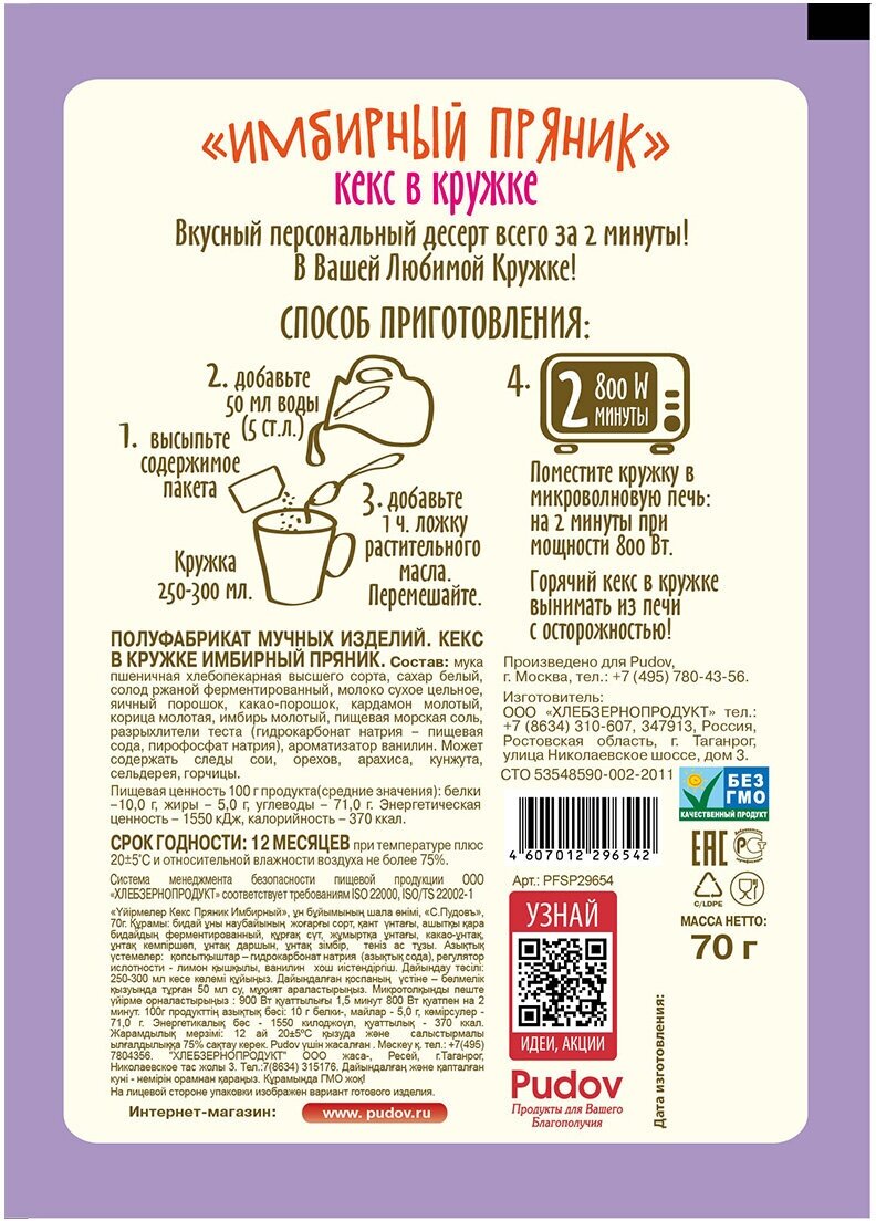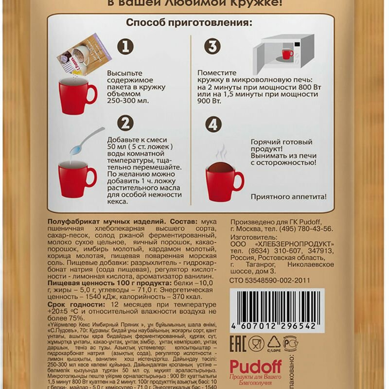 Готовая смесь для выпечки десерта прямо в кружке станет вашим любимым лакомством в обеденный перерыв на работе, на завтрак перед выходом из дома. Всего 2 минуты, и на вашем столе нежнейших рассыпчатый вкусный кекс! «Имбирный пряник» - персональный десерт в вашей любимой кружке!Состав: мука пшеничная хлебопекарная в/с, сахар белый, солод ржаной ферментированный, молоко сухое цельное, яичный порошок, какао-порошок, имбирь молотый, кардамон молотый, корица молотая, пищевая морская соль, разрыхлители теста (гидрокарбонат натрия - пищевая сода, пирофосфат натрия), ароматизатор ванилин. Может содержать следы сои, орехов, арахиса, кунжута, сельдерея, горчицы.Пищевая ценность в 100 г готового продукта: белки: 10,0 г жиры: 5,0 г углеводы: 71,0 г Энергетическая ценность: 1550 кДж, калорийность: 370 ккал.Срок годности: 12 месяцев. Хранить при температуре +20±5С и относительной влажности воздуха не более 75%.