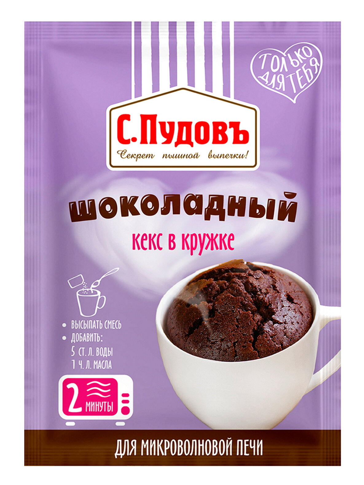 Следуя современным кулинарным трендам – готовить легко и быстро, «С. Пудовъ» выпустил инновационный продукт – кекс в кружке «Шоколадный», который готовится за две минуты в микроволновой печи.Шоколадный кекс – классический десерт с ярким узнаваемым вкусом. У кекса получается влажная, пористая, нежная текстура.Вам не нужно ждать праздника или особого события, чтобы порадовать себя и близких этой выпечкой.А ещё это удобно, ведь не нужно искать рецепт, высчитывать нужное количество ингредиентов, использовать разнообразные кухонные принадлежности. Возьмите готовую смесь «Кекс в кружке Шоколадный», включите микроволновку и за пару минут ваш порционный десерт готов. С этим справится даже ребенок.Пакетик готовой смеси удобно брать с собой на работу или в дальние поездки. Всего две минуты и вкусный десерт готов.Способ приготовления:1. Высыпьте содержимое пакета в кружку 200-250 мл.2. Добавьте к смеси 50 мл (5 ст. л.) воды комнатной температуры, тщательно перемешайте. Пожеланию нужно добавить 1 ч. л. растительного масла для особой нежности кекса.3. Поместите кружку в микроволновую печь: на 2 минуты при мощности 800 Вт или на 1,5 минуты при мощности 900 Вт.4. Горячий готовый продукт! Вынимать из печи с осторожностью.Приятного аппетита!Состав: сахар белый, мука пшеничная хлебопекарная в/с, какао-порошок, молоко сухое цельное, яичный порошок, пищевая морская соль, разрыхлители теста ( гидрокарбонат натрия - сода пищевая, пирофосфат натрия), ароматизатор ванилин.Пищевая ценность в 100 г готового продукта: белки: 10,0 г жиры: 7,0 г углеводы: 69,0 гЭнергетическая ценность: 1590 кДж, калорийность: 380 ккал.Срок годности: 12 месяцев. Хранить при температуре +20±5С и относительной влажности воздуха не более 75%.