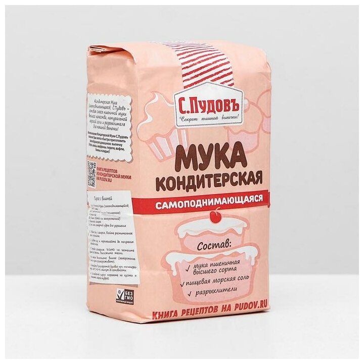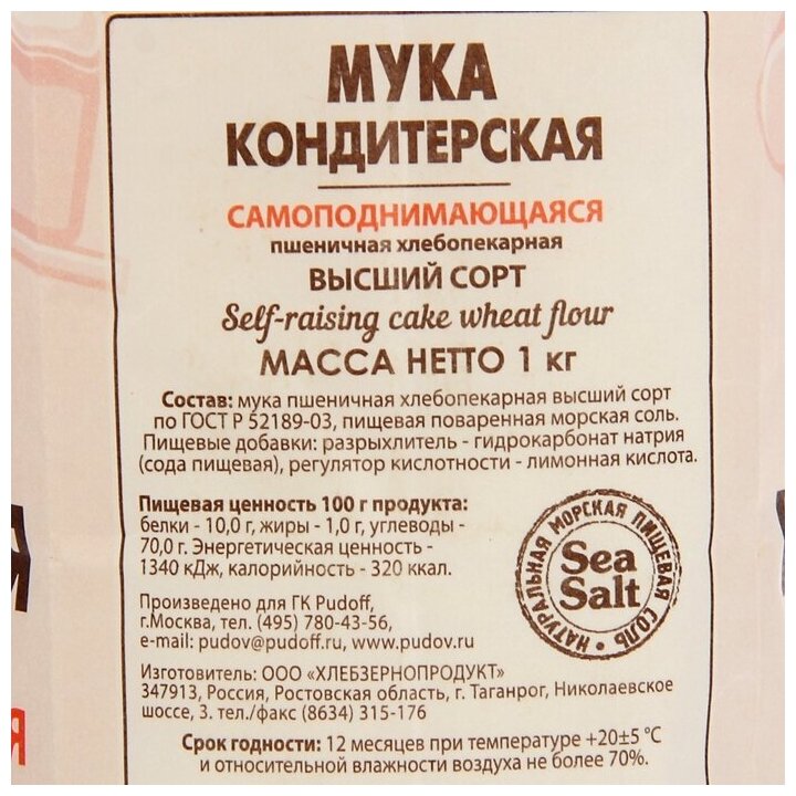 Мука кондитерская «С. Пудовъ» - сбалансированная смесь из отобранной муки, прогрессивного разрыхлителя и натуральной морской соли для пышной и вкусной выпечки.Это профессиональная основа для выпечки на разрыхлителе: кексов, бисквитов, маффинов, печенья, блинов и оладий.Мы тщательно следим на производстве, чтобы в каждой упаковке муки кондитерской вы получали правильную пропорцию муки, разрыхлителя и натуральной морской соли.При этом разрыхлитель в отличие от соды с лимонной кислотой не оставляет послевкусия, а морская соль подчеркивает вкус выпечки. В состав муки кондитерской входит только тщательно отобранная мука, смолотая из мягкой пшеницы, содержащей количество белка, необходимое для легкой и воздушной выпечки.Мука имеет прекрасную текстуру и соответствует самым строгим стандартам в индустрии. Кондитерская мука не требует просеивания.Готовьте нежное печенье, пышные блины, кексы с хрустящей корочкой, воздушные бисквиты.А вместо взвешивания и высчитывания соотношений муки, разрыхлителя и соли возьмите муку кондитерскую «С. Пудовъ», а сэкономленное время проведите с семьей.Мука кондитерская незаменима на кухне!Состав: мука пшеничная хлебопекарная высшего сорта, пищевая морская соль, пищевые добавкигидрокарбонат натрия - пищевая сода, пирофосфат натрия). Без ГМО.Пищевая ценность в 100 г готового продукта: белки - 10,0 г, жиры - 1,0 г, углеводы - 70,0 г.Энергетическая ценность: 1380 кДж, калорийность: 330 ккал.Срок годности: 12 месяцевХранить при температуре +20±5С и относительной влажности воздуха не более 70%.