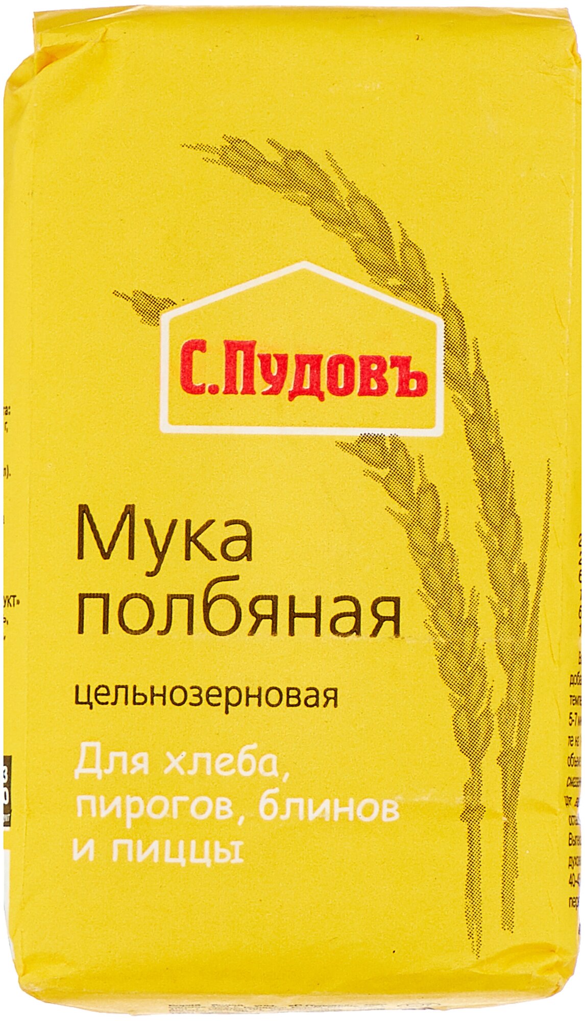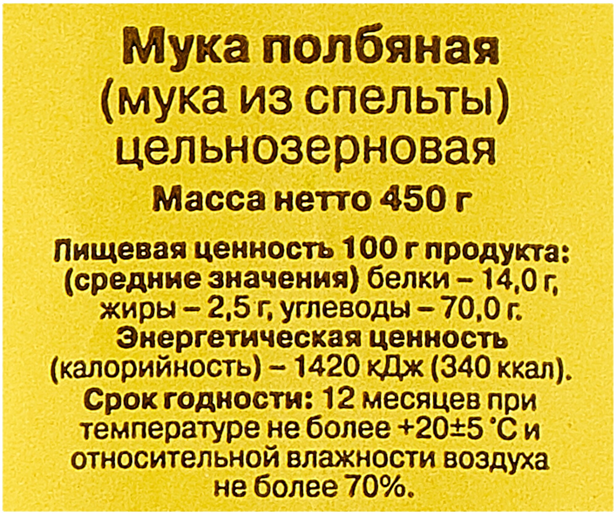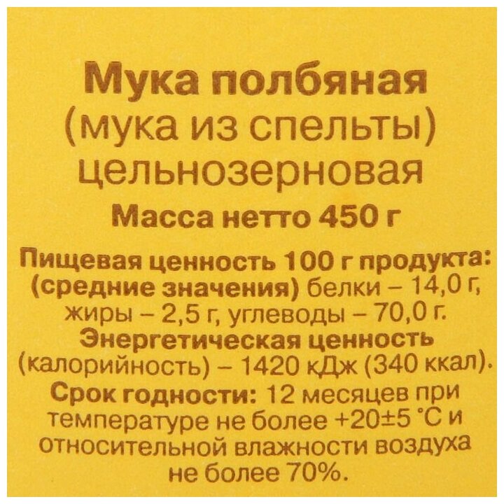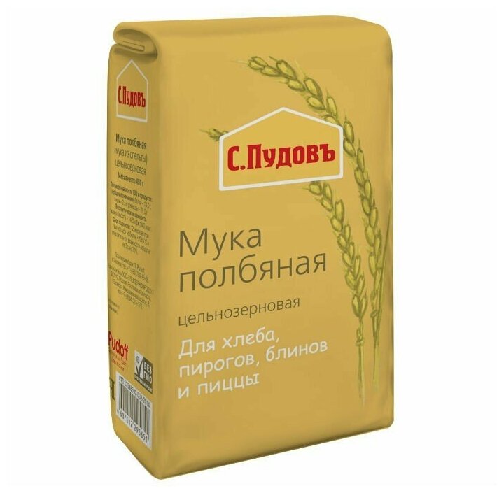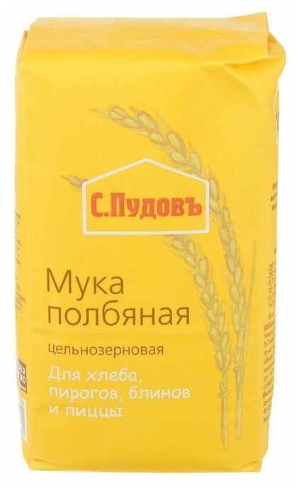 Полбяная цельнозерновая мука «С. Пудовъ» сохранила все полезные свойства злаковой культуры.Её рекомендуют для диетического питания.Считается, что именно полбяная мука содержит самый полный перечень полезных для организма веществ.Полба – самый древний сорт пшеницы, но главное достоинство этого злака – высокое содержание витаминов, микроэлементов, аминокислот и белка.Полбяная цельнозерновая мука имеет плотную структуру, обладает тонким ореховым вкусом.Идеально подходит для выпечки хлеба, пирогов, печенья, блинов и пиццы.Оцените вкус и пользу полбяной муки «С. Пудовъ» - вам понравится!Состав: мука полбяная.Пищевая ценность в 100 г готового продукта: белки - 14,0 г, жиры - 2,5 г, углеводы - 70,0 г.Энергетическая ценность: 1510 кДж, калорийность: 360 ккал.Срок годности: 12 месяцевХранить при температуре +20±5С и относительной влажности воздуха не более 70%.