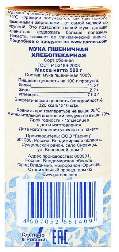 Мука Гарнец Пшеничная обойная цельнозерновая 500г